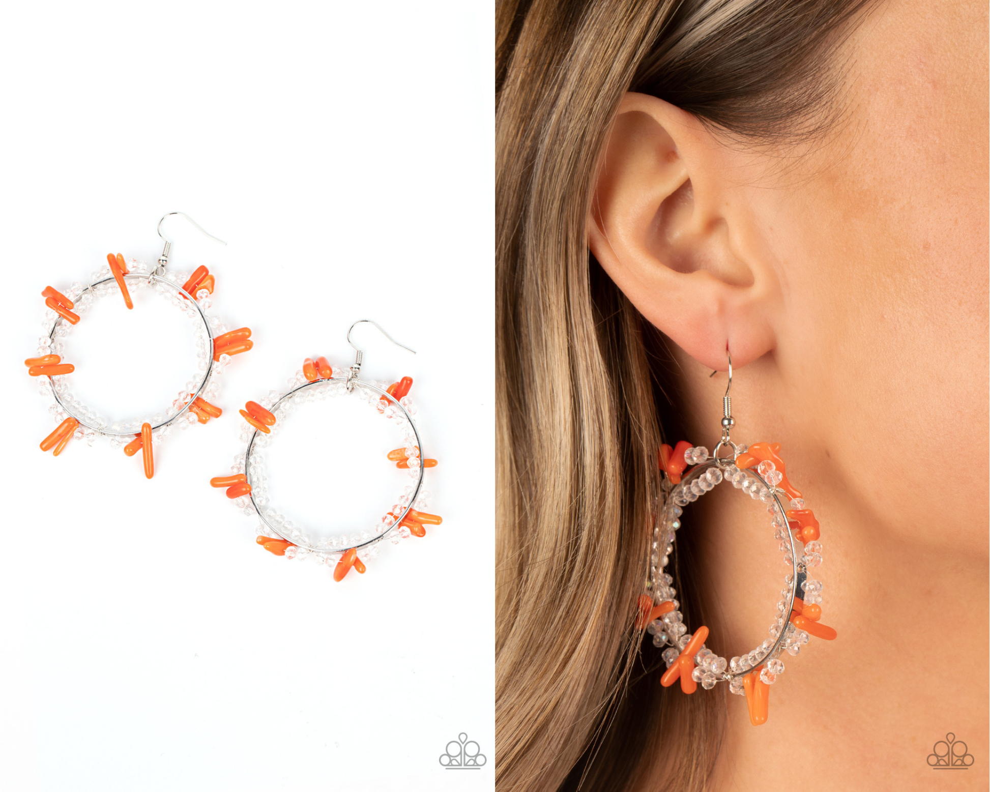 Dainty crystal-like beads and orange shell-like pieces are threaded along dainty wires, creating glitzy loops around an oversized silver ring for a beach inspired fashion. Earring attaches to a standard fishhook fitting.
