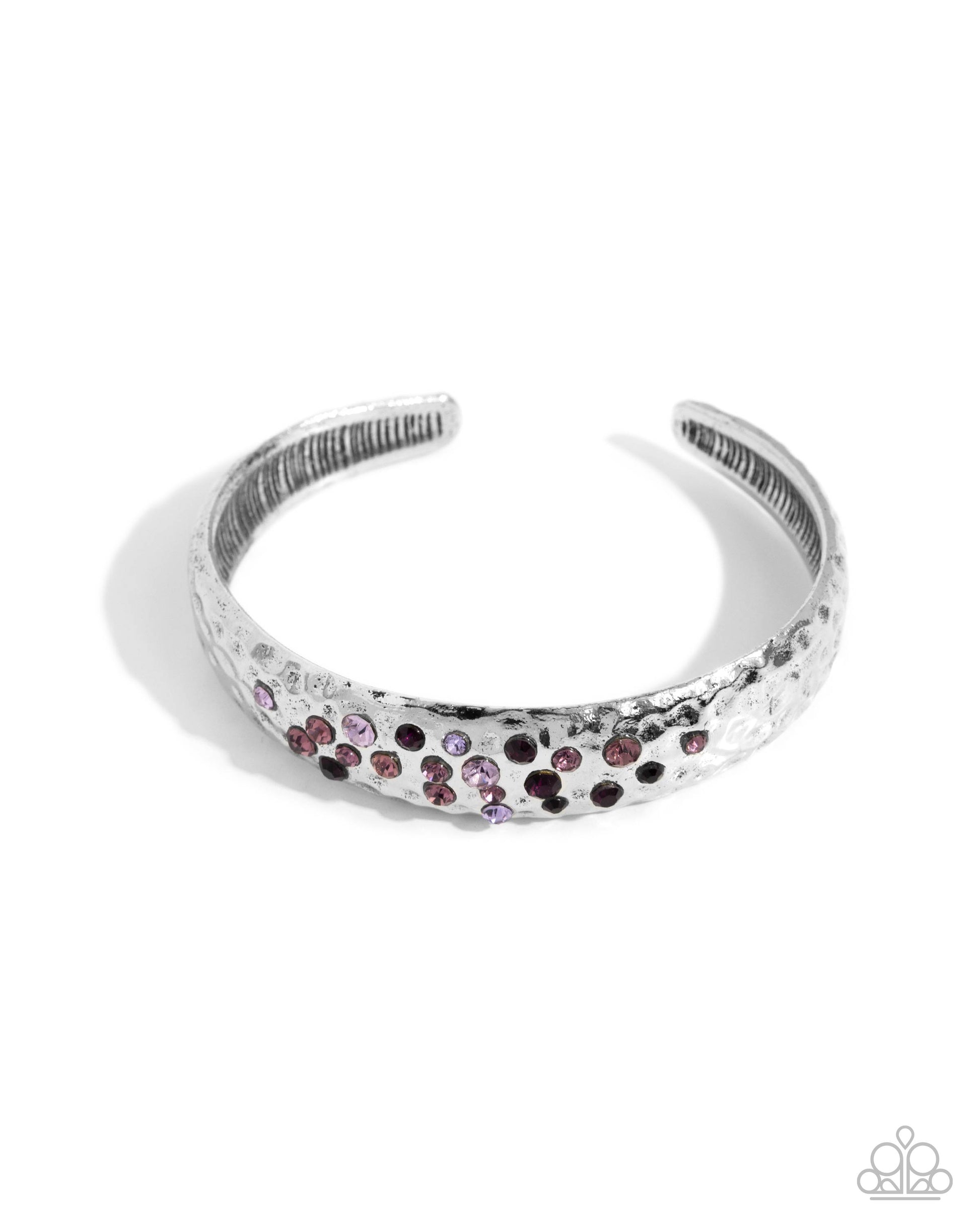 Dusted atop the front of a hammered silver cuff, a collection of light amethyst, amethyst, and violet rhinestones glisten atop the wrist for a radically refined look. Due to its haphazard palette, placement may vary.