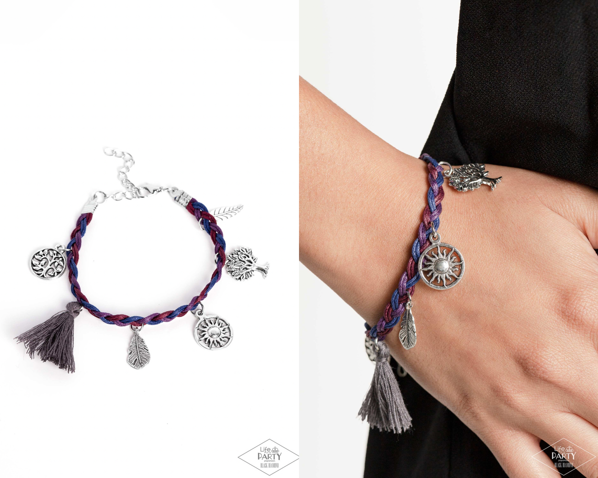 Shiny blue, red, and purple cording weaves into a colorful braid across the wrist. Radiant silver charms and a soft threaded tassel swing from the wrist in a free-spirited, wanderlust fashion. Features an adjustable clasp closure.