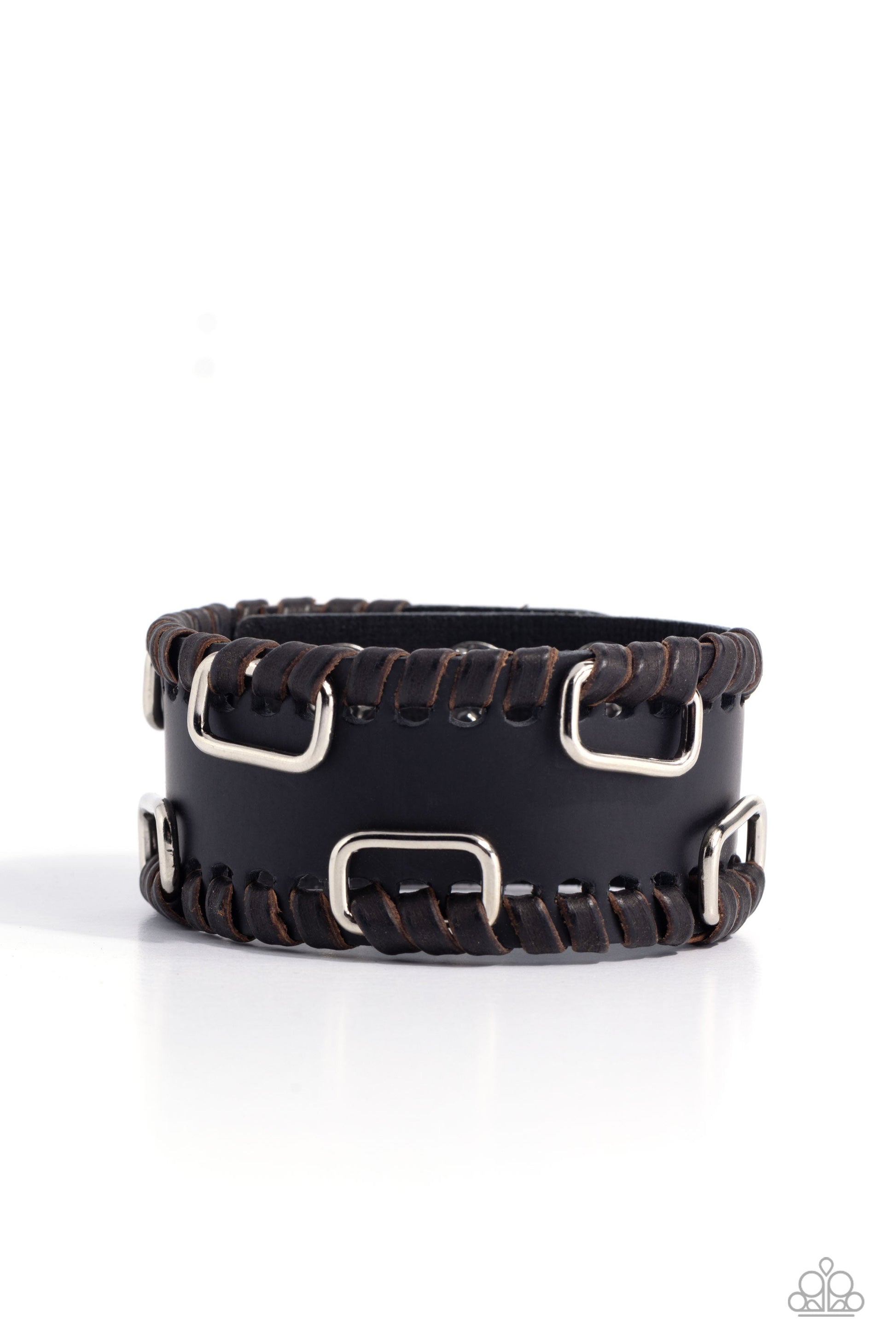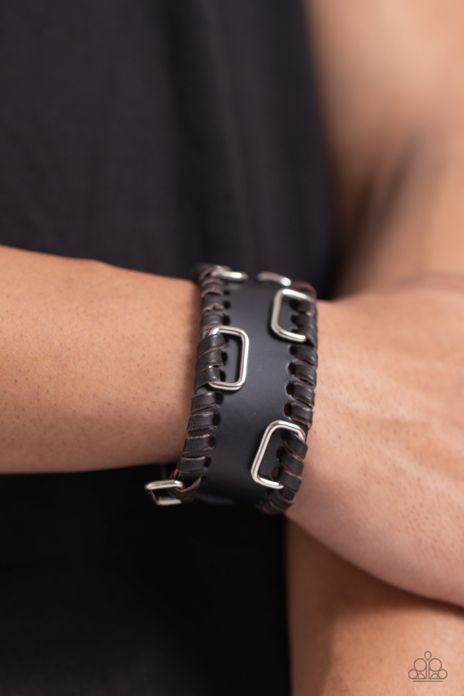 Distressed leather laces are threaded along the edges of a thick black leather band, knotting silver rectangular links in place across the front for an edgy finish. Features an adjustable snap closure.