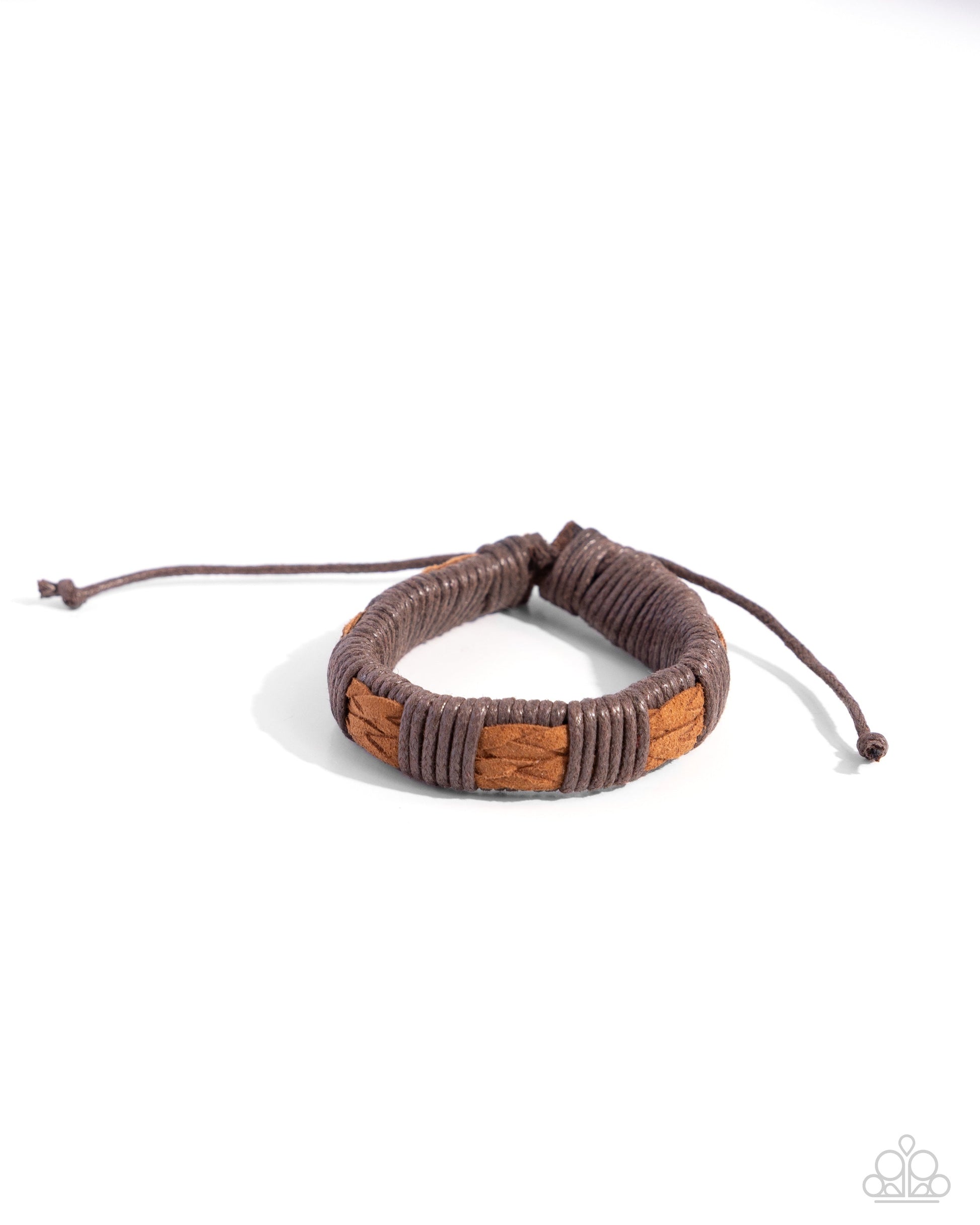 Brown cording wraps around a leather band, securing a pair of suede bands in place around the wrist for a pop of rustic texture. Features an adjustable sliding knot closure.