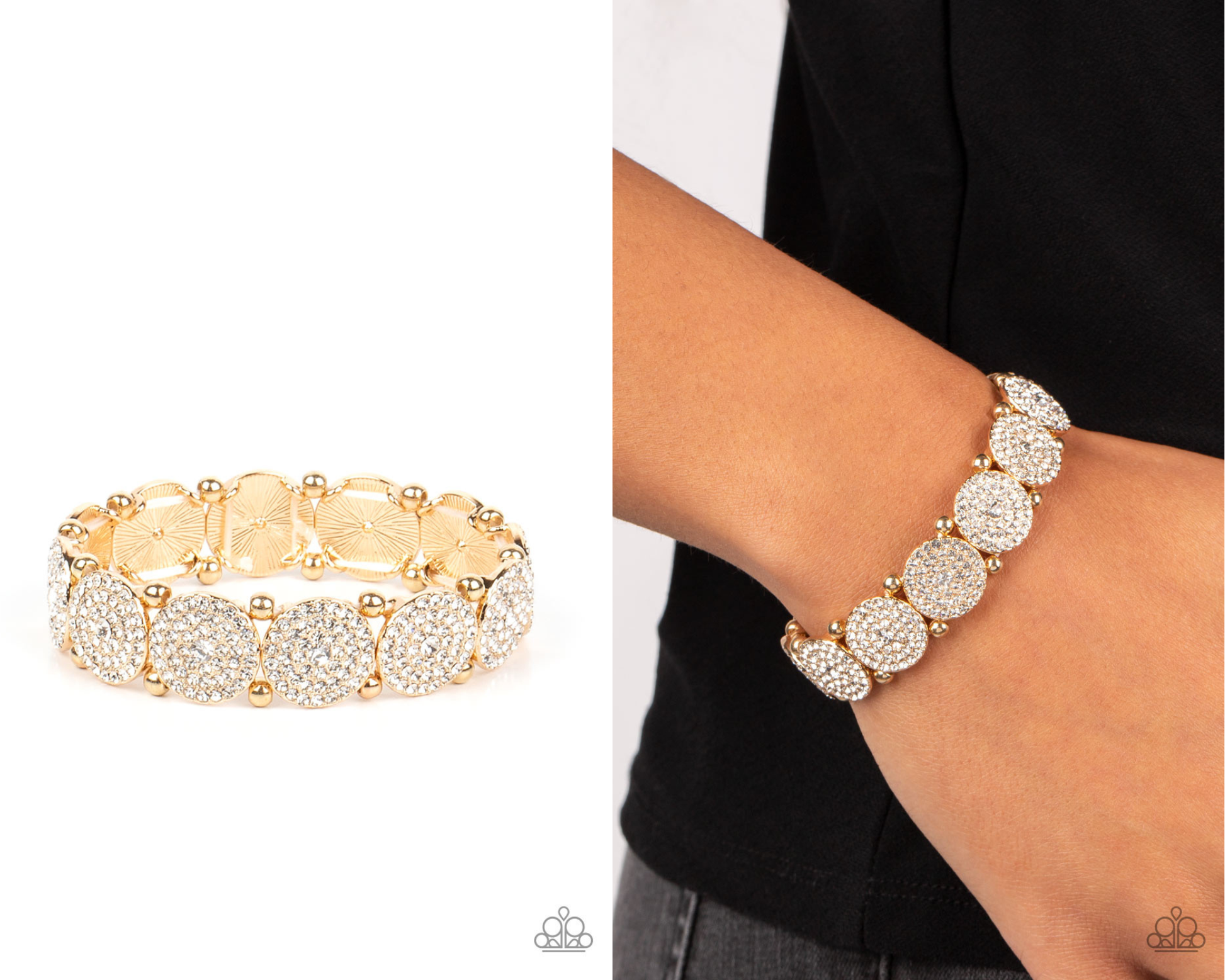 Separated by pairs of gold beads, icy white rhinestone encrusted gold frames glitter along stretchy bands around the wrist for a timeless twinkle.