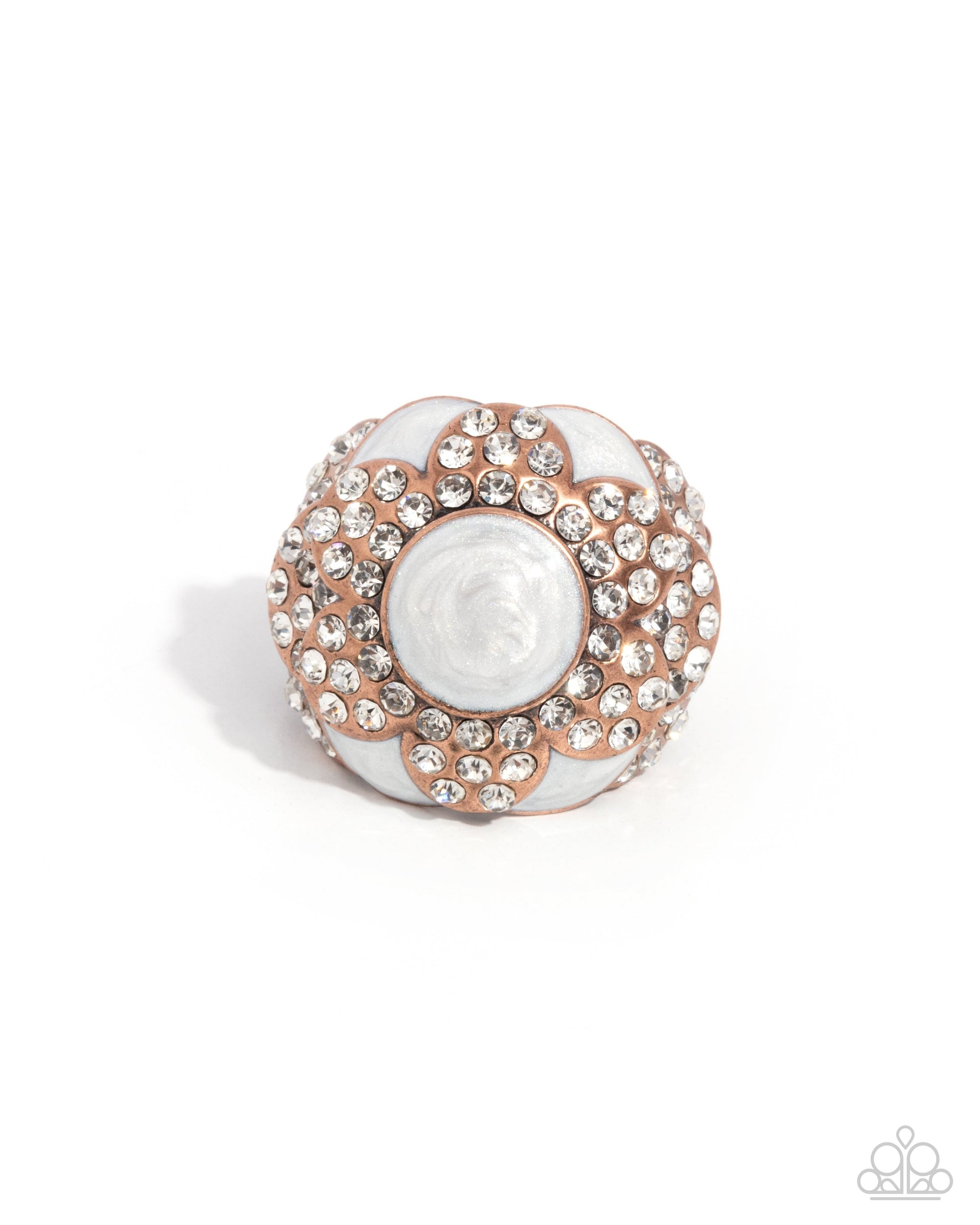 Featuring white rhinestones, copper petals encircle a shimmery white pearl-painted center for a fantastically floral statement. Additional white rhinestone-embellished copper petals and white pearl-painted folds create a three-dimensional centerpiece of glitz and glam. Features a stretchy band for a flexible fit.