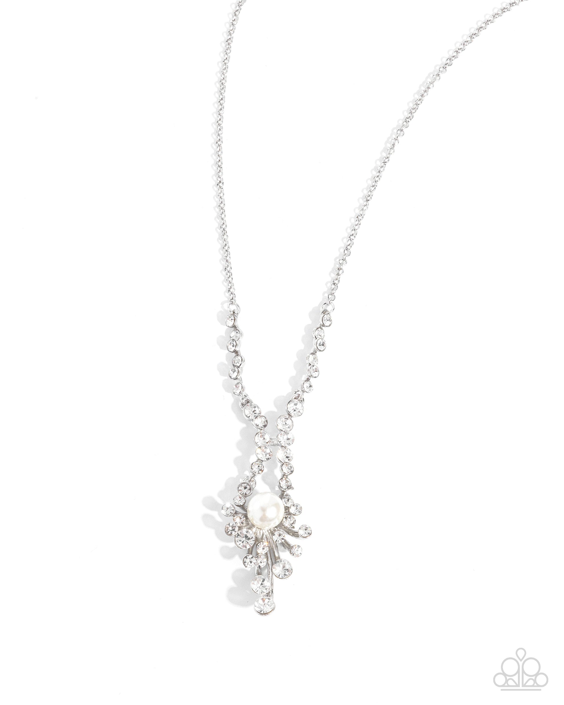 Pressed in bubbly silver fittings, glistening white rhinestones in varying sizes bend and curl around a glossy, oversized white pearl in an abstract, floral-inspired manner from a dainty silver chain for an eye-catching eccentric display. Features an adjustable clasp closure.