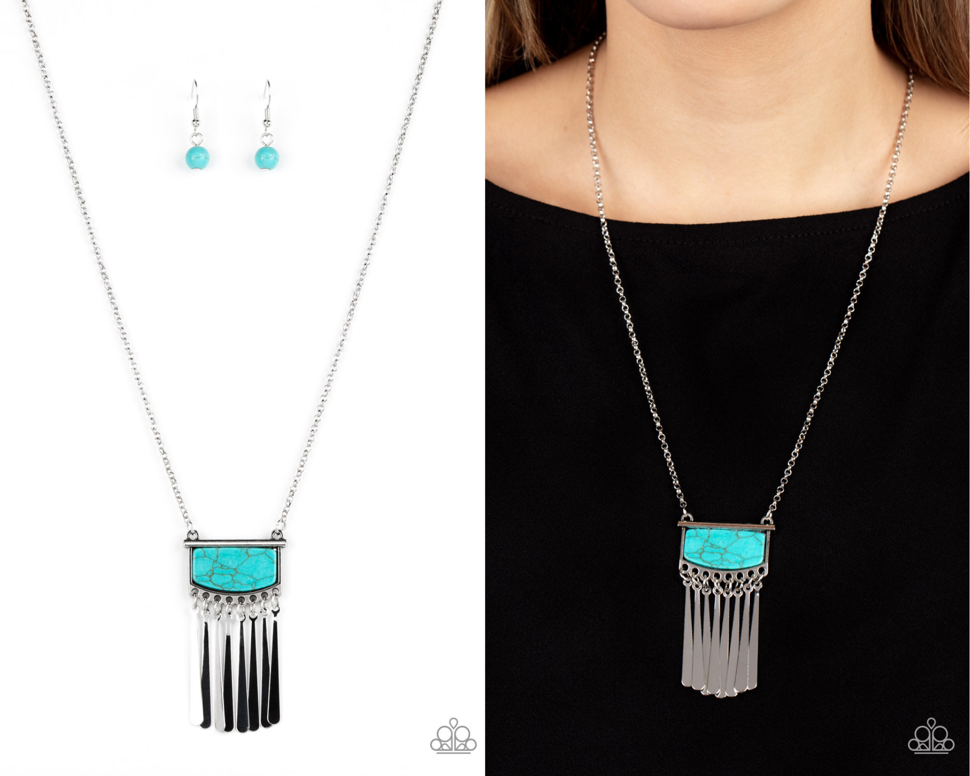 An asymmetrical rectangular turquoise stone, encased in a simple silver frame, is adorned with a fringe of flared silver bars at the end of a classic silver chain for a rustically flirty finish. Features an adjustable clasp closure.
