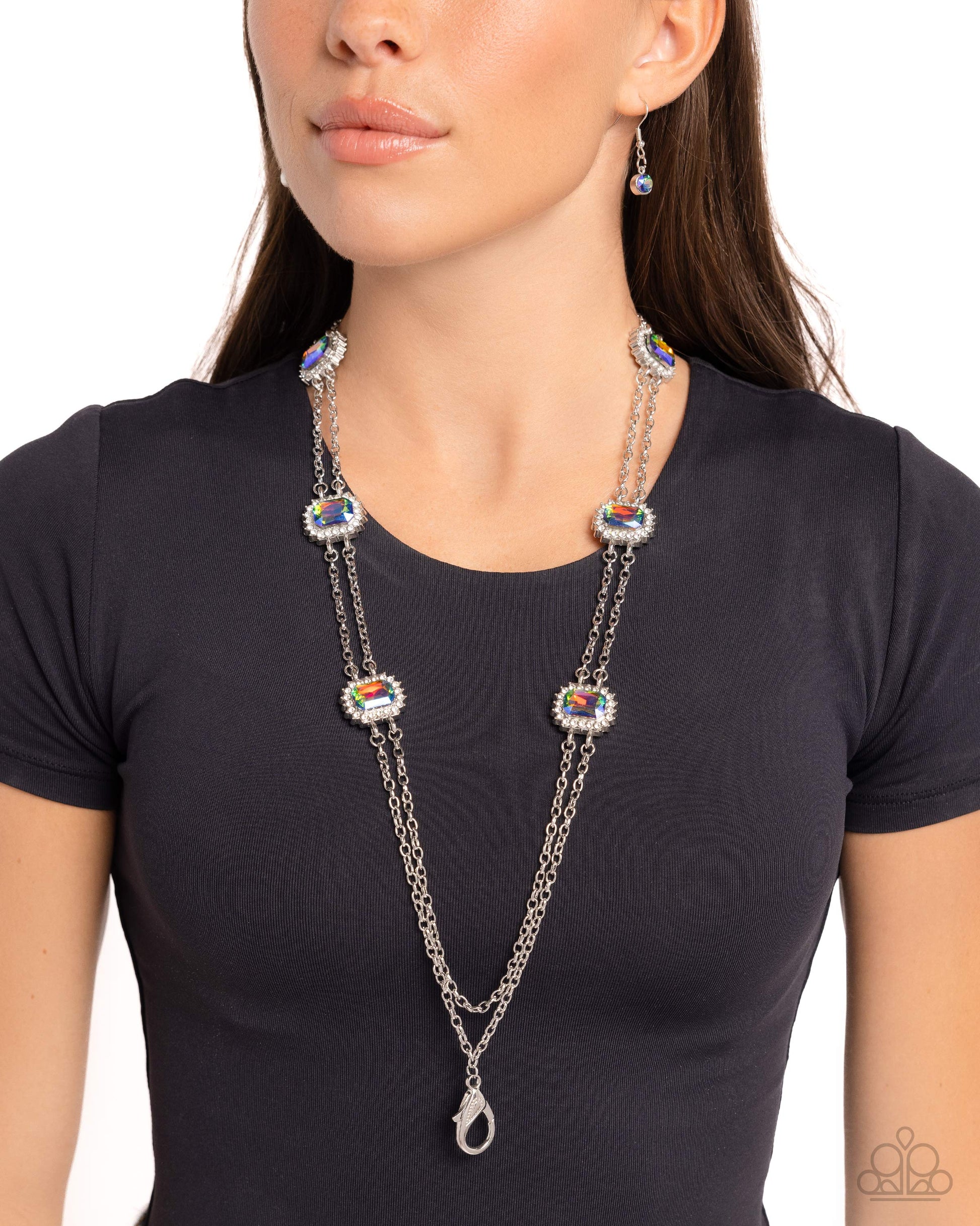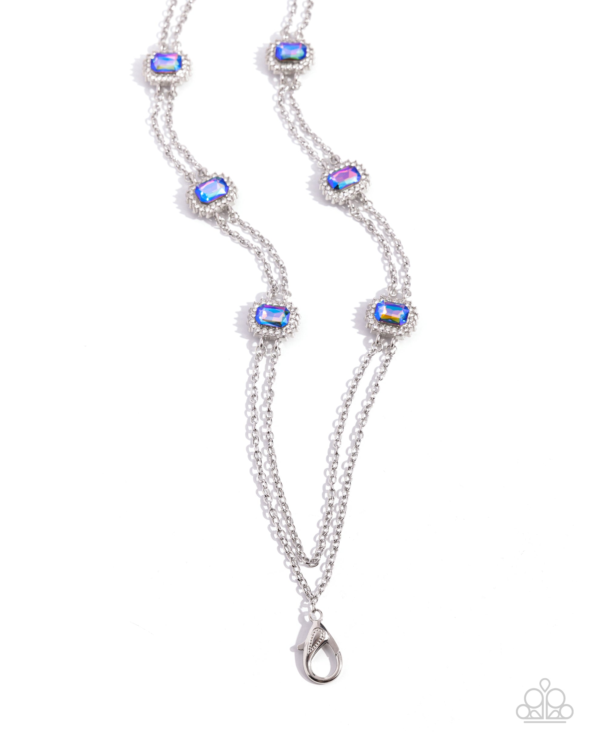 Pressed in sunburst-like, rhinestone-encrusted pronged silver fittings, a collection of emerald-cut UV shimmery gems are infused between a double-strand of silver chains for a standout statement. A lobster clasp hangs from the bottom of the design to allow a name badge or other item to be attached. Features an adjustable clasp closure.