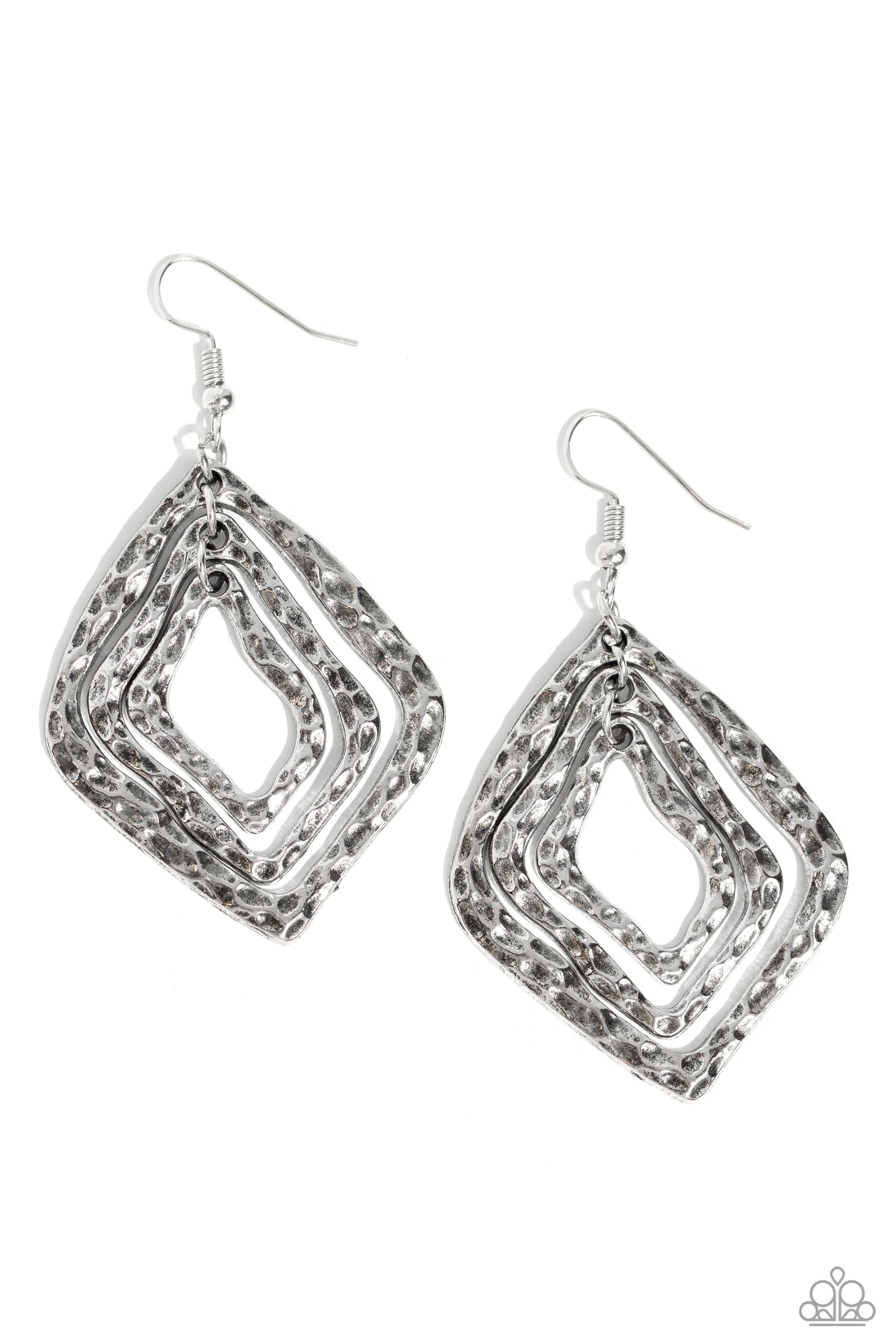 A trio of antiqued hammered silver pendants molded into irregular diamond-shaped frames in graduating sizes, nestle inside one another creating a harmoniously tinkling lure. Earring attaches to a standard fishhook fitting.