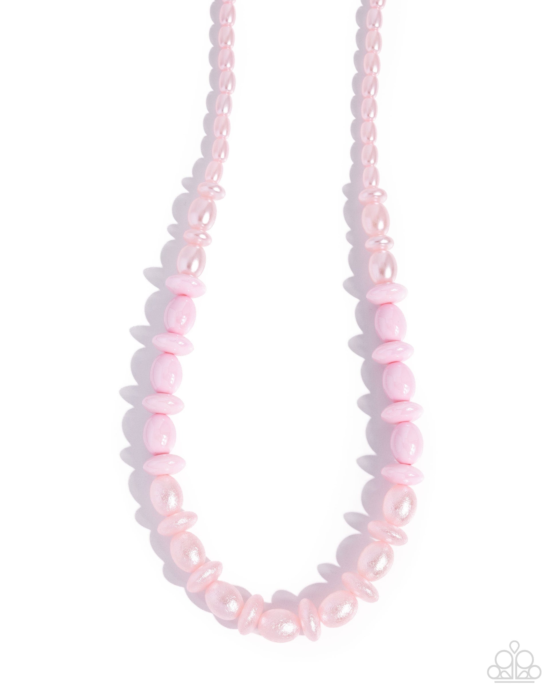 Infused along an invisible string, a collection of baby pink pearls in varying shapes, baby pink milk iridescent beads in varying shapes, and crackle baby pink pearls pattern below the neckline in sections for a pop of princess color. Features an adjustable clasp closure. Due to its prismatic palette, color may vary.