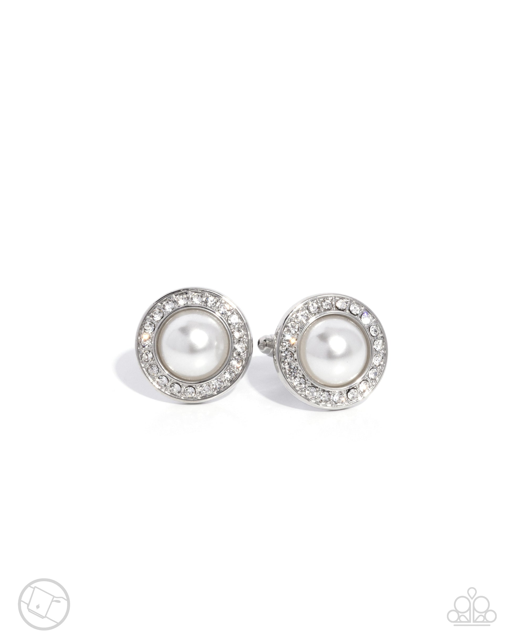 Pressed in a thick silver border of white rhinestones, a glistening half-white pearl stands out for a cultured cuff link.