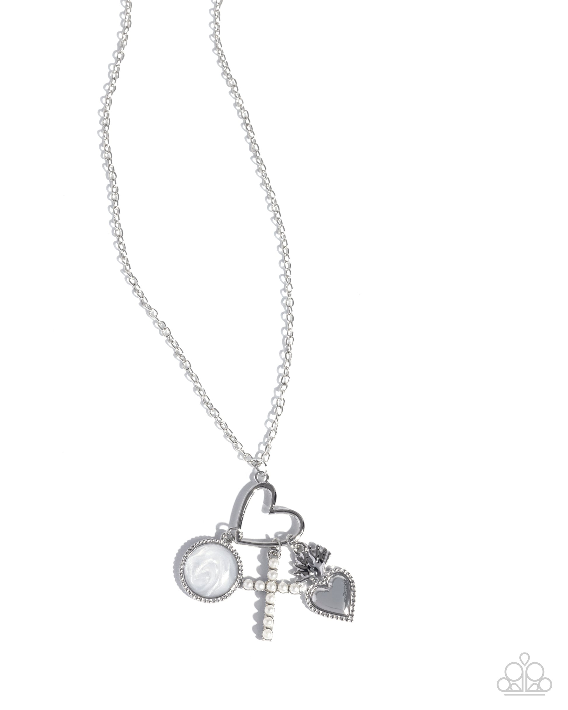 A collection of silver charms, including a heart outline, a pearl-painted round disc, a pearl-encrusted cross, and an embossed heart, dangles from a delicate silver chain, creating a sentimental design. Features an adjustable clasp closure.
