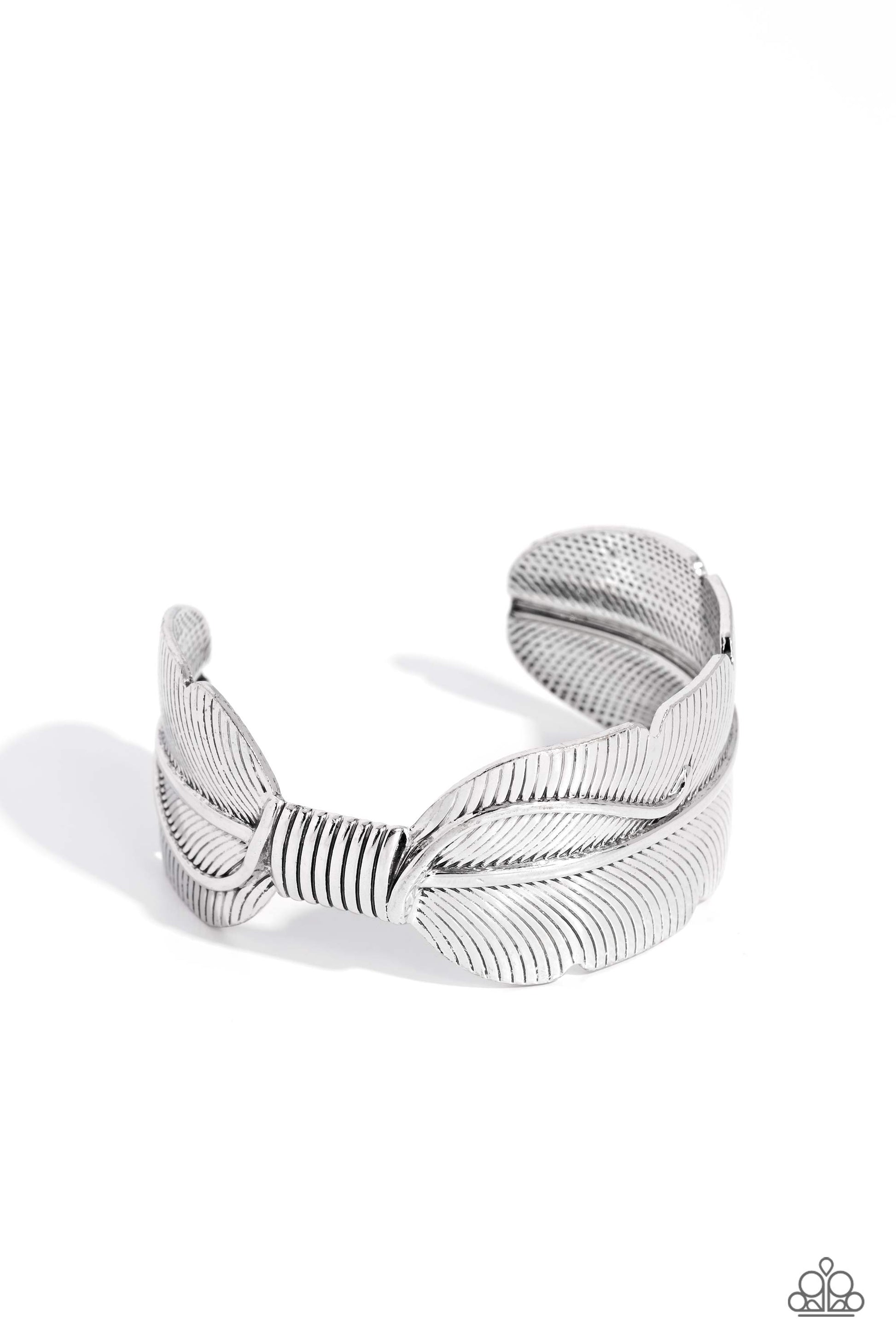 Infused with faux metal laces, an oversized silver feather asymmetrically curls around the wrist for a whimsical Southwestern vibe.