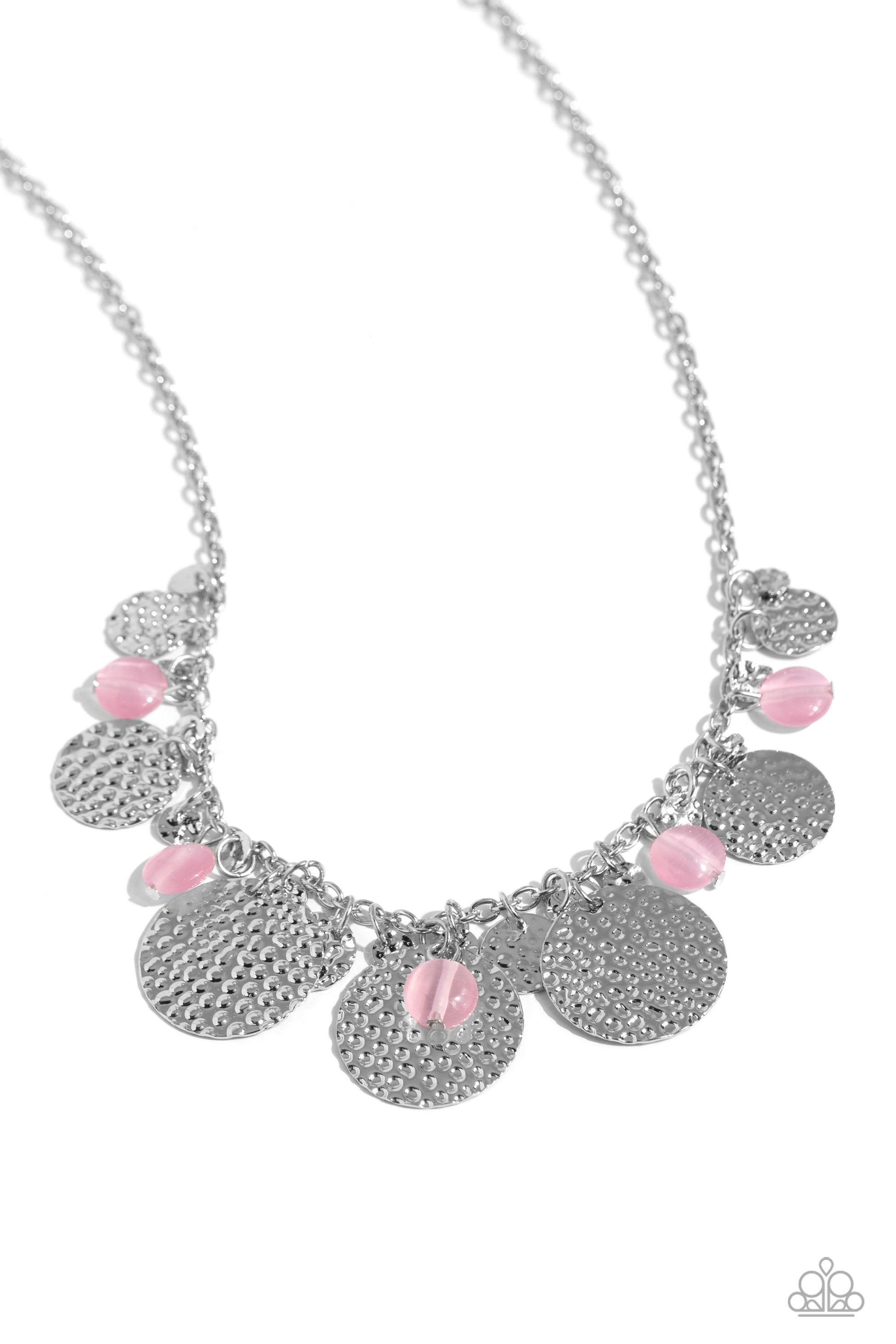 Cascading from a classic silver chain, a collection of various-sized hammered silver discs and baby pink cat's eye beads twinkle below the neckline for a radiant display. Features an adjustable clasp closure.