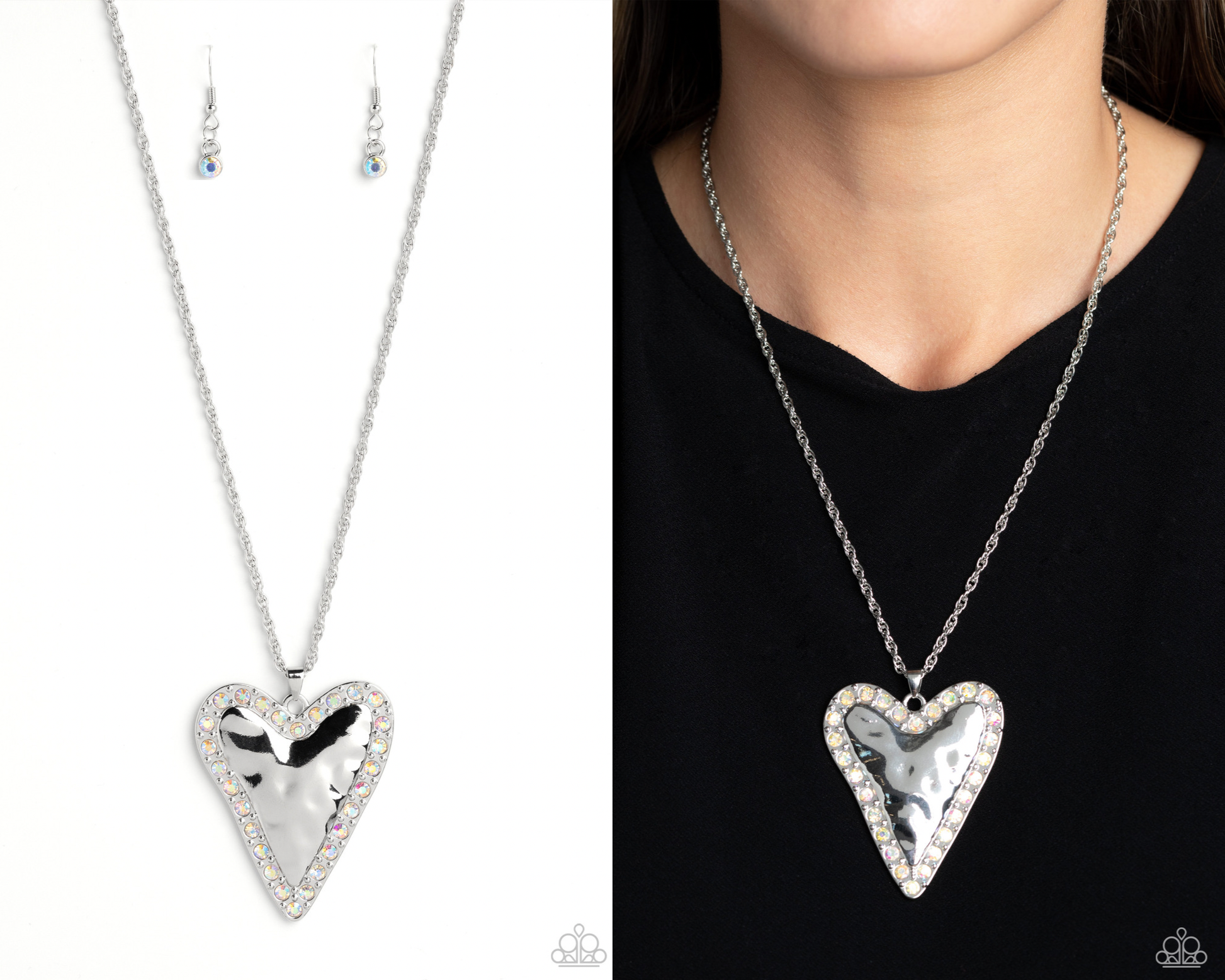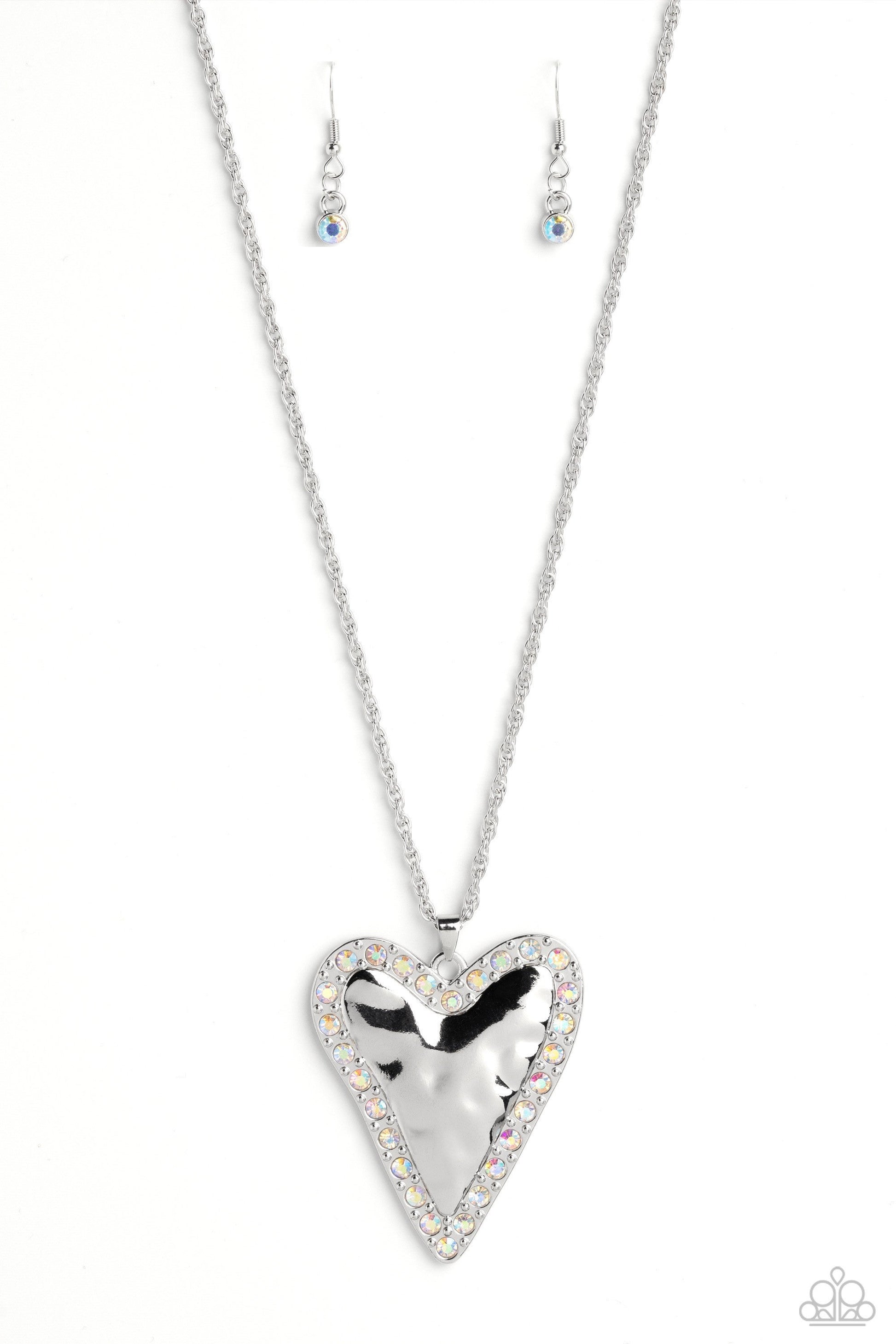 Hammered in antiqued texture, an oversized, abstract silver heart swings from the bottom of a silver chain for a whimsical look. Silver studs and glittery iridescent gems border the hammered texture for a touch of bling. Features an adjustable clasp closure. Due to its prismatic palette, color may vary.