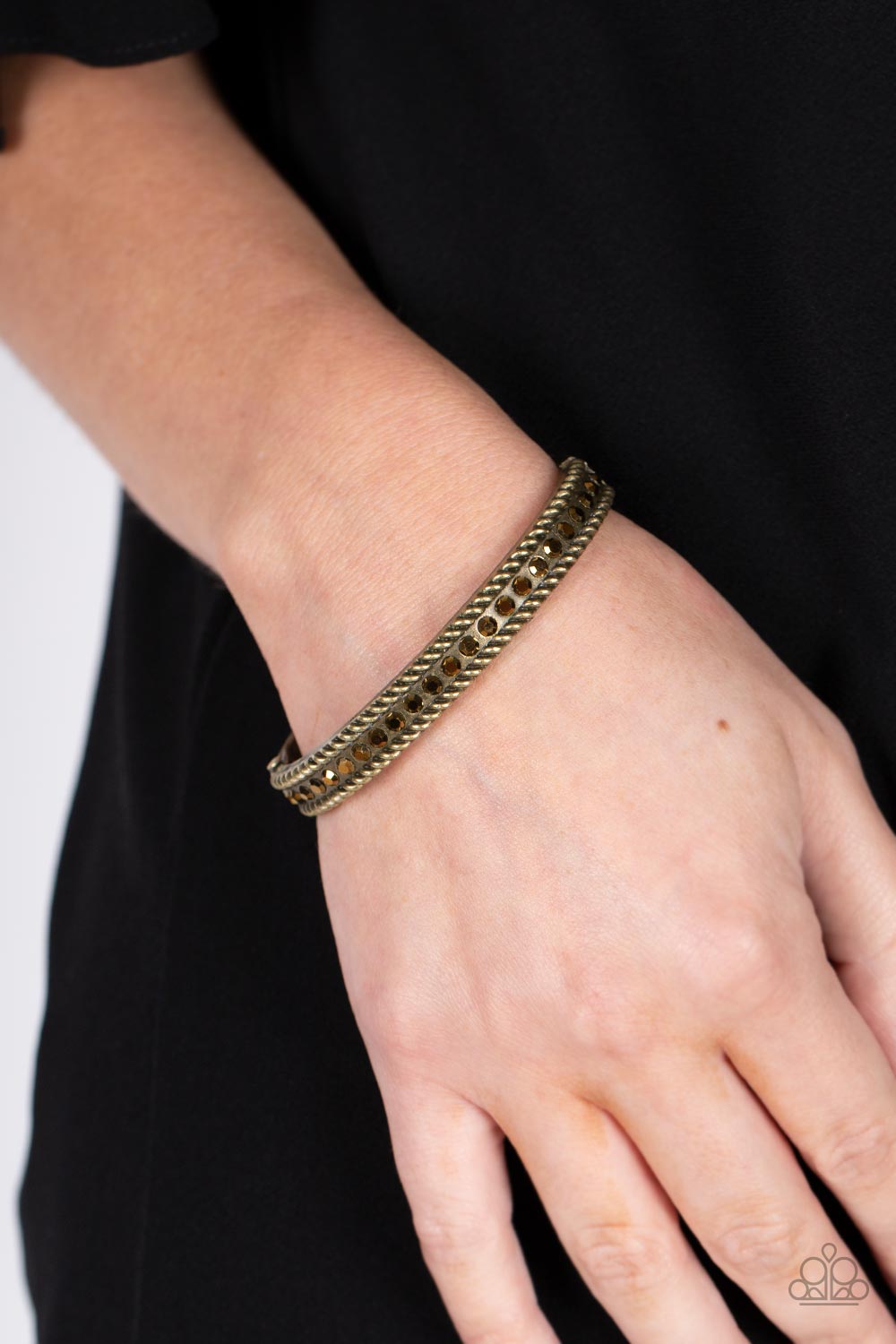 Brassy rope-like borders flank a glitzy row of aurum rhinestones, creating a smoldering bangle-like bracelet around the wrist. Features a hinged closure.