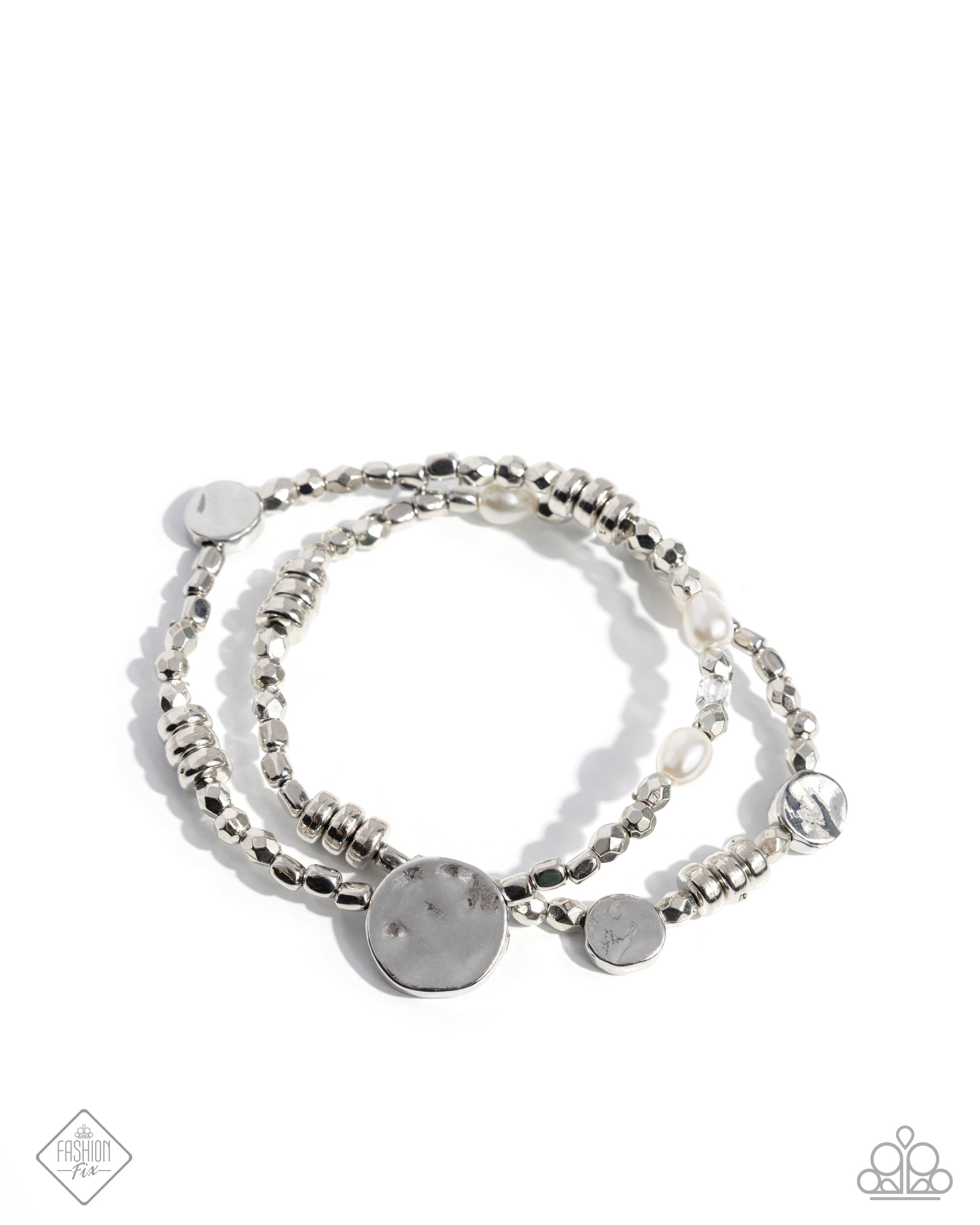 Infused along elastic stretchy bands, a collection of silver discs, silver beads, hammered silver discs, oval white pearls, and textured silver beads stack along the wrist for a refined radical display.