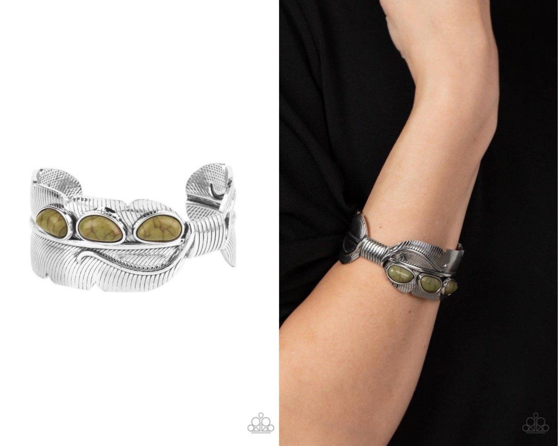 A trio of asymmetrical Olive Branch stones embellishes the front of a lifelike textured silver feather that curls around the wrist, creating an authentic southwestern cuff.