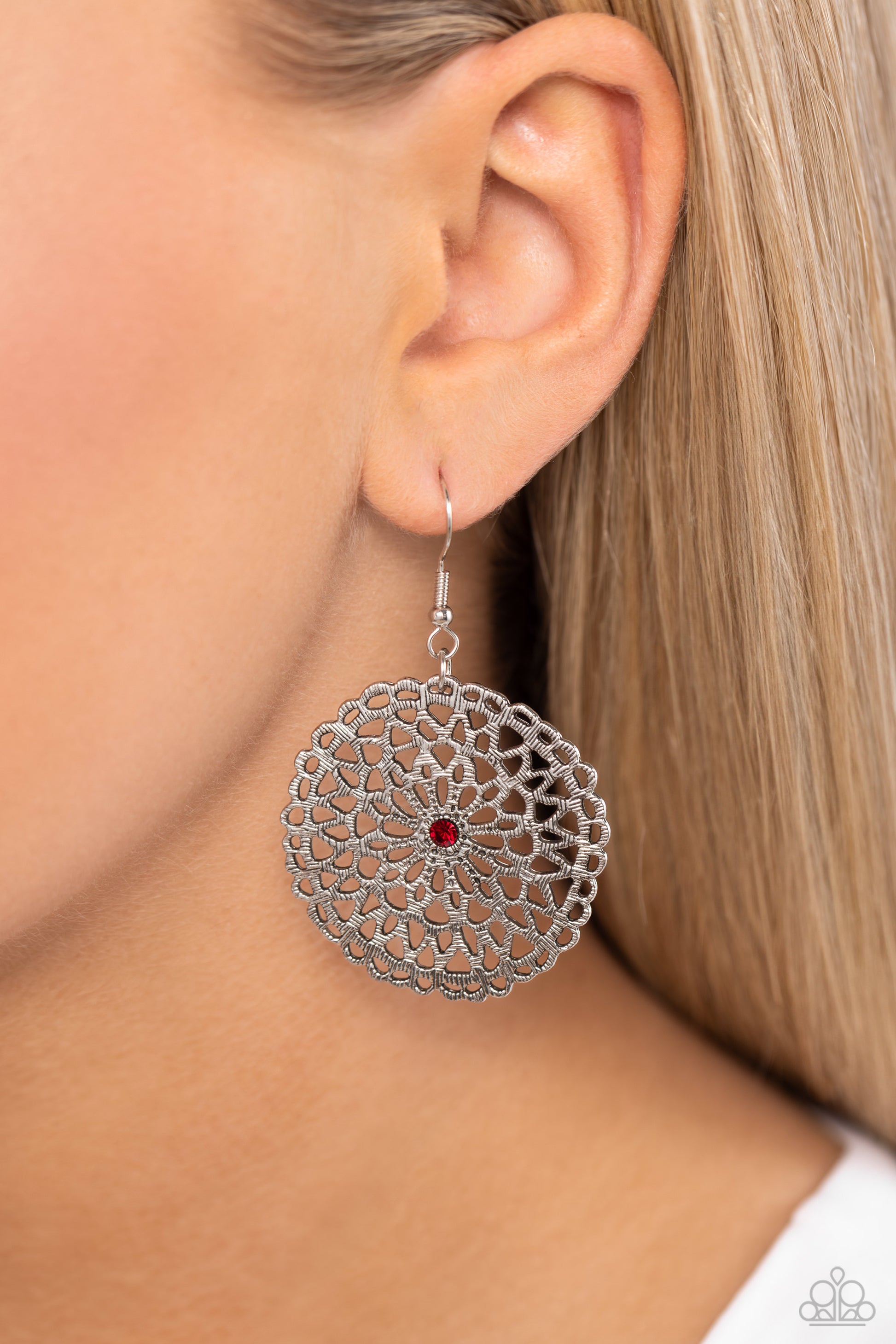Adorned with a dainty red rhinestone sprinkled center, textured and stenciled silver petals bloom inside an asymmetrically scalloped frame for a whimsical floral fashion. Earring attaches to a standard fishhook fitting.