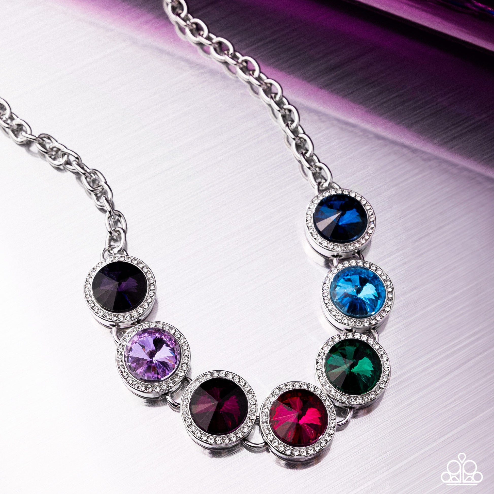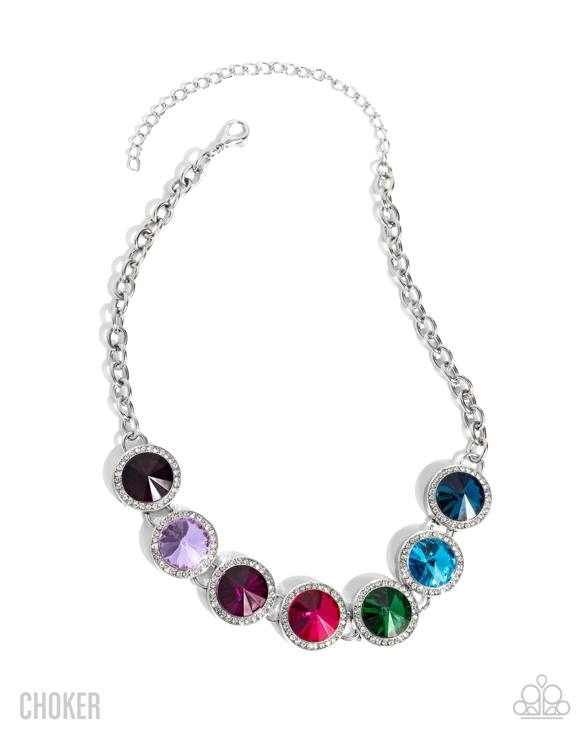 Encased in sleek white rhinestone-dusted silver frames, faceted round multicolored gems shimmer below the neckline from a glistening silver chain for a colorfully chic look. Features an adjustable clasp closure. Sold as one individual choker necklace.