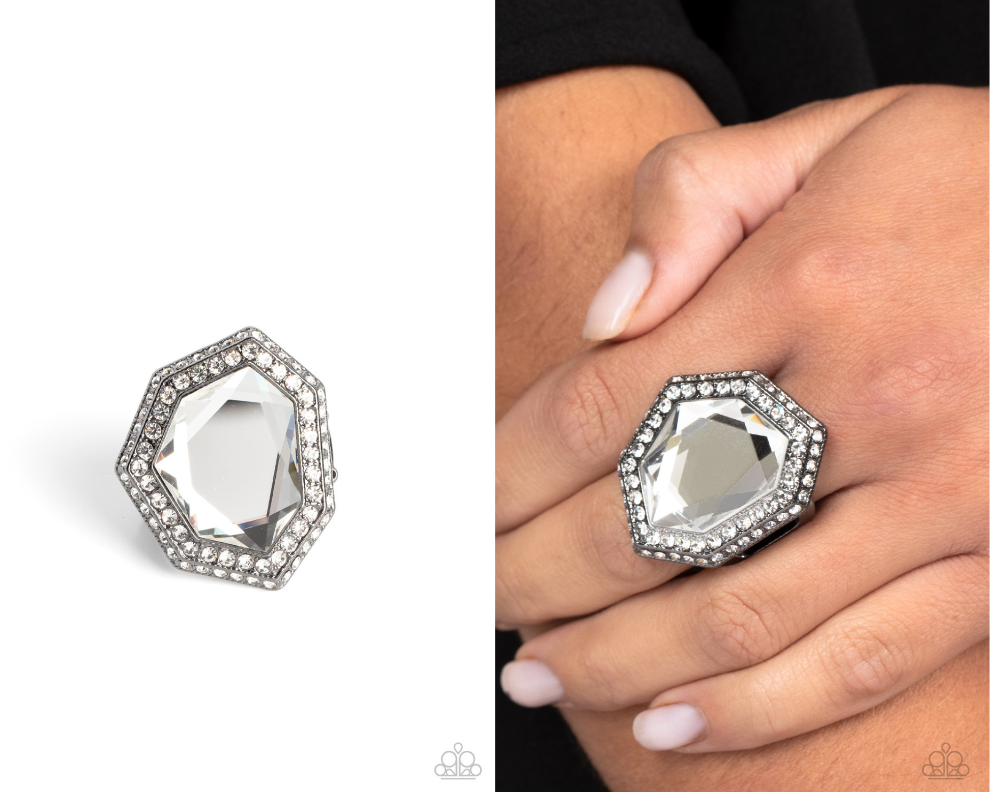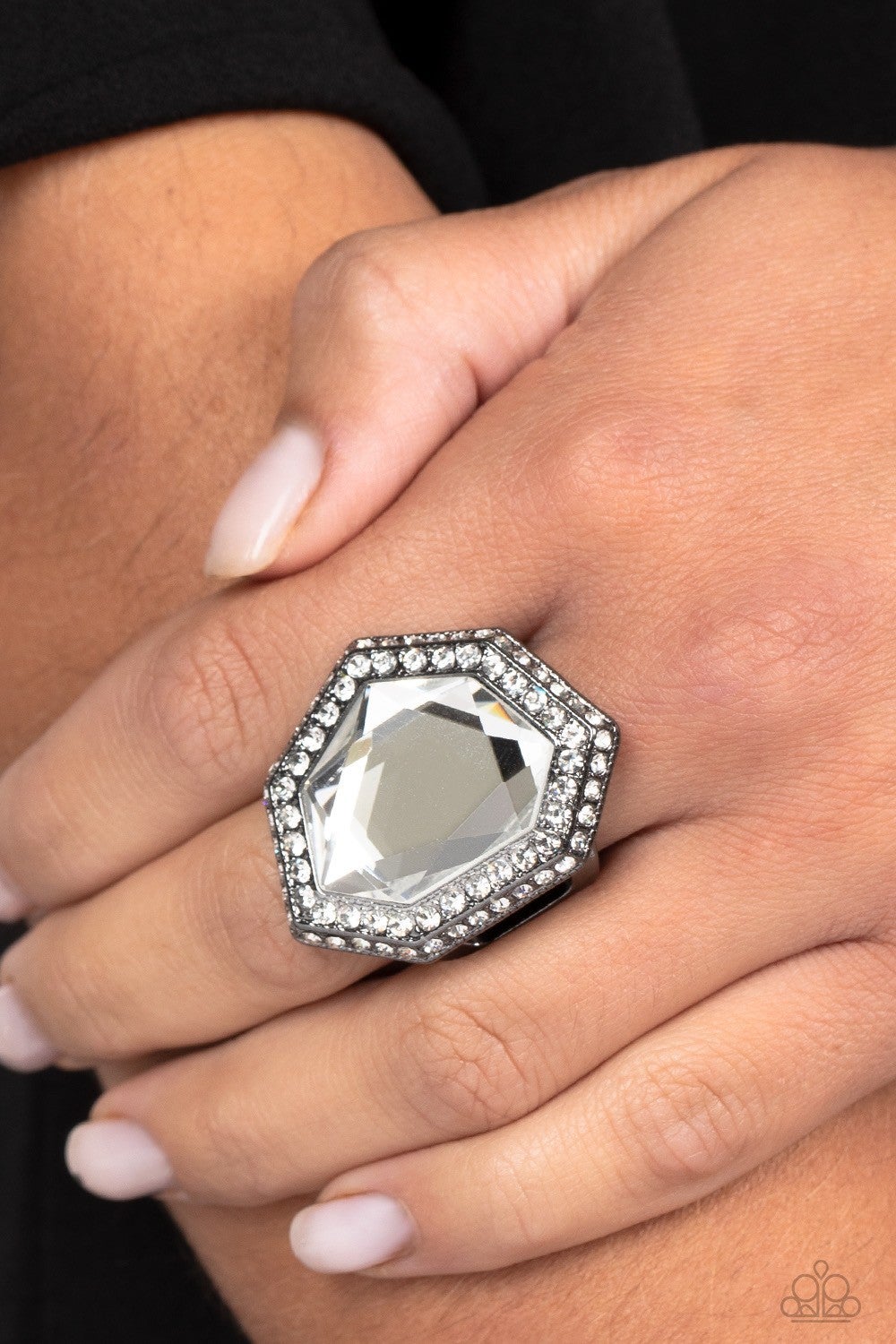 An oversized, asymmetrical, white gem smolders inside an asymmetrical, gunmetal dual frame encrusted with dainty white rhinestones. The resulting sparkle combines into a jaw-dropping, exaggerated centerpiece atop the finger. Features a stretchy band for a flexible fit.