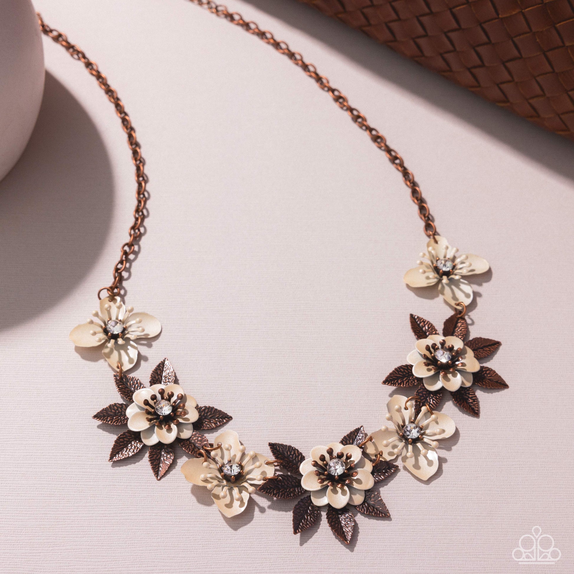 Connecting to a classic copper chain, a collection of cream pearlescent-painted flowers with white rhinestone centers and white-studded filaments alternates with layered pearlescent-painted petals with copper-studded centers and white rhinestone centers, with textured, framing copper leaves for an over-the-top whimsical display. Features an adjustable clasp closure.