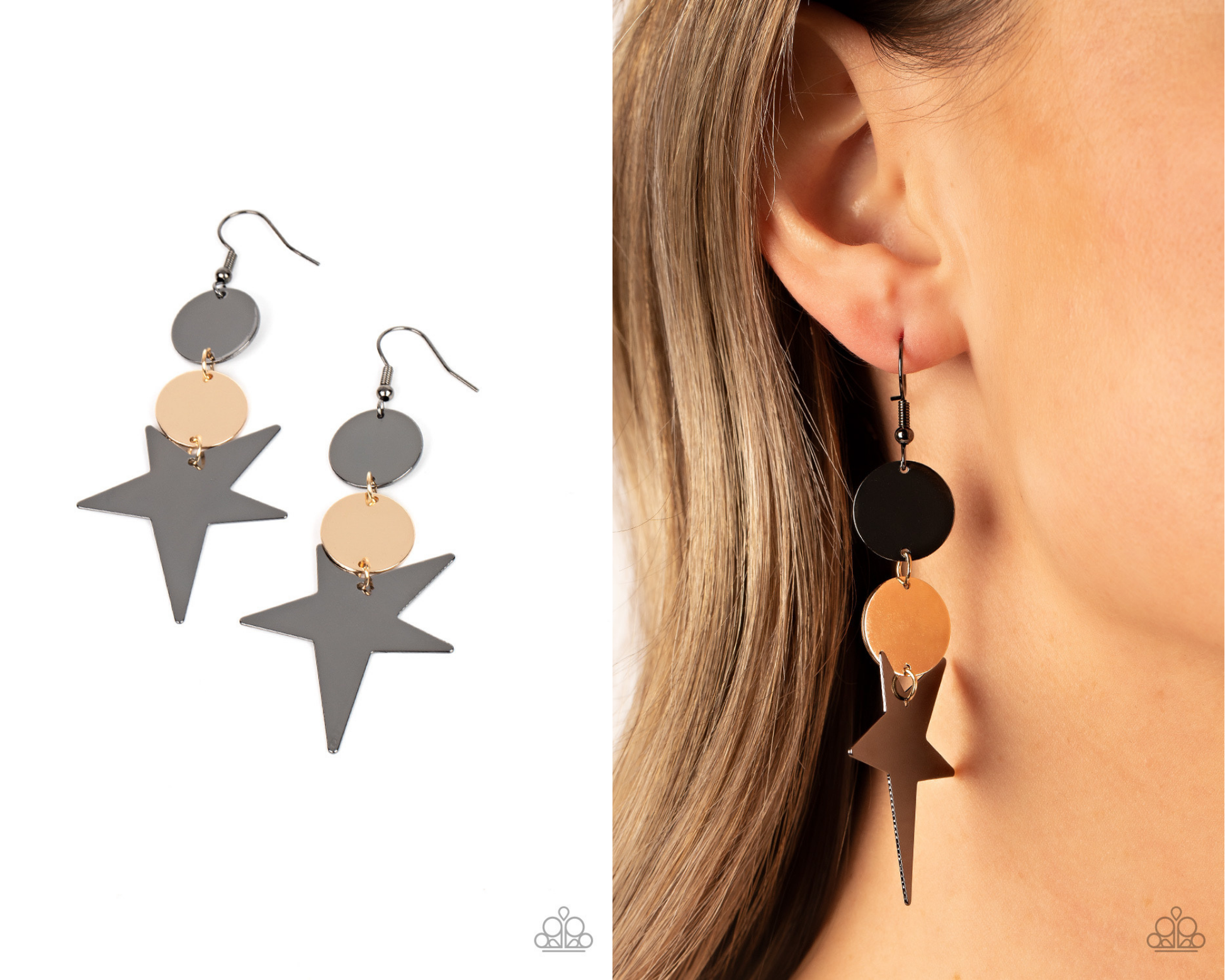 An asymmetrical gunmetal star radiates from two linked flat gold and gunmetal discs, resulting in a stellar lure. Earring attaches to a standard fishhook fitting.