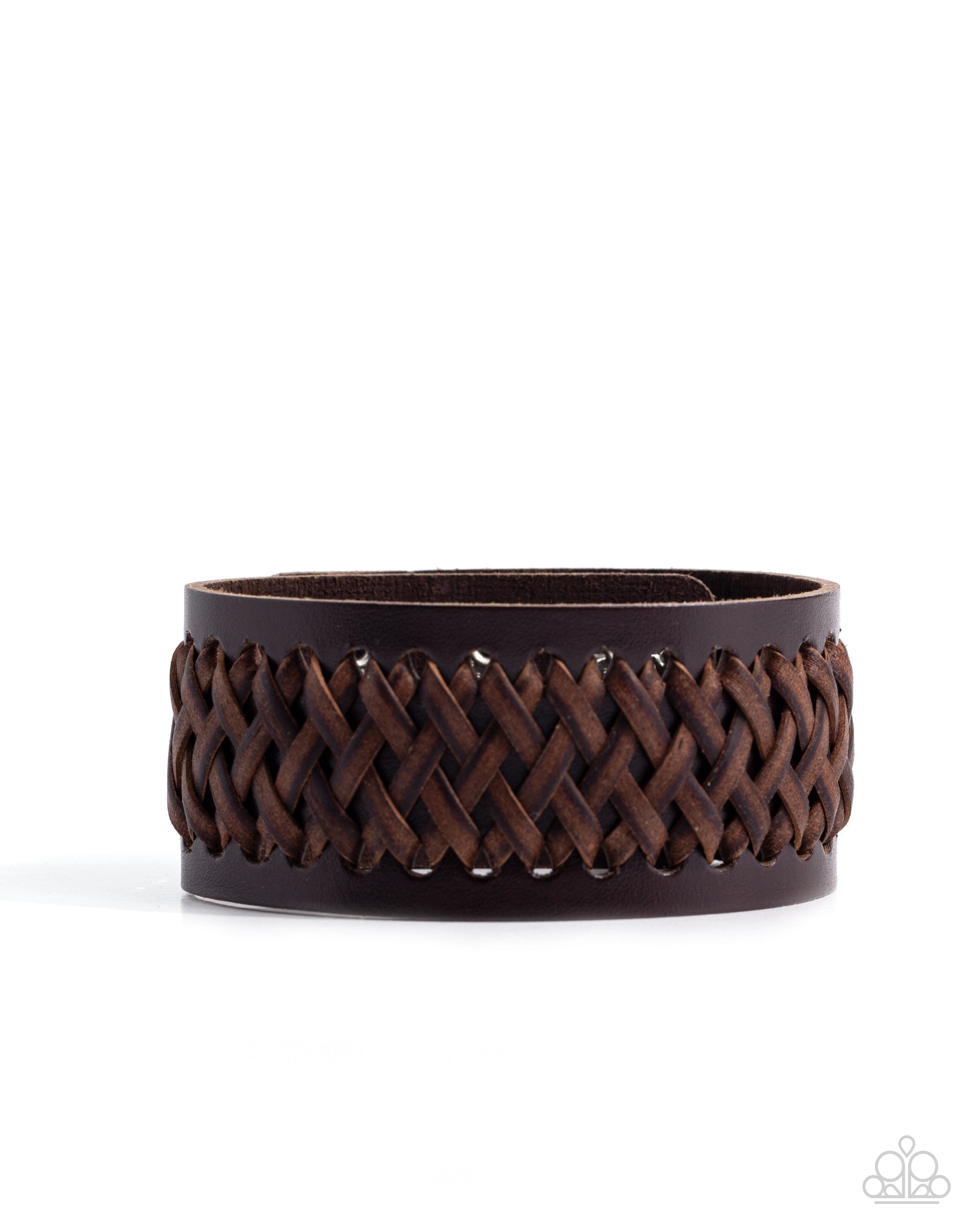 Distressed leather laces are threaded along a thick brown leather band, creating rugged crisscrosses around the wrist. Features an adjustable snap closure.