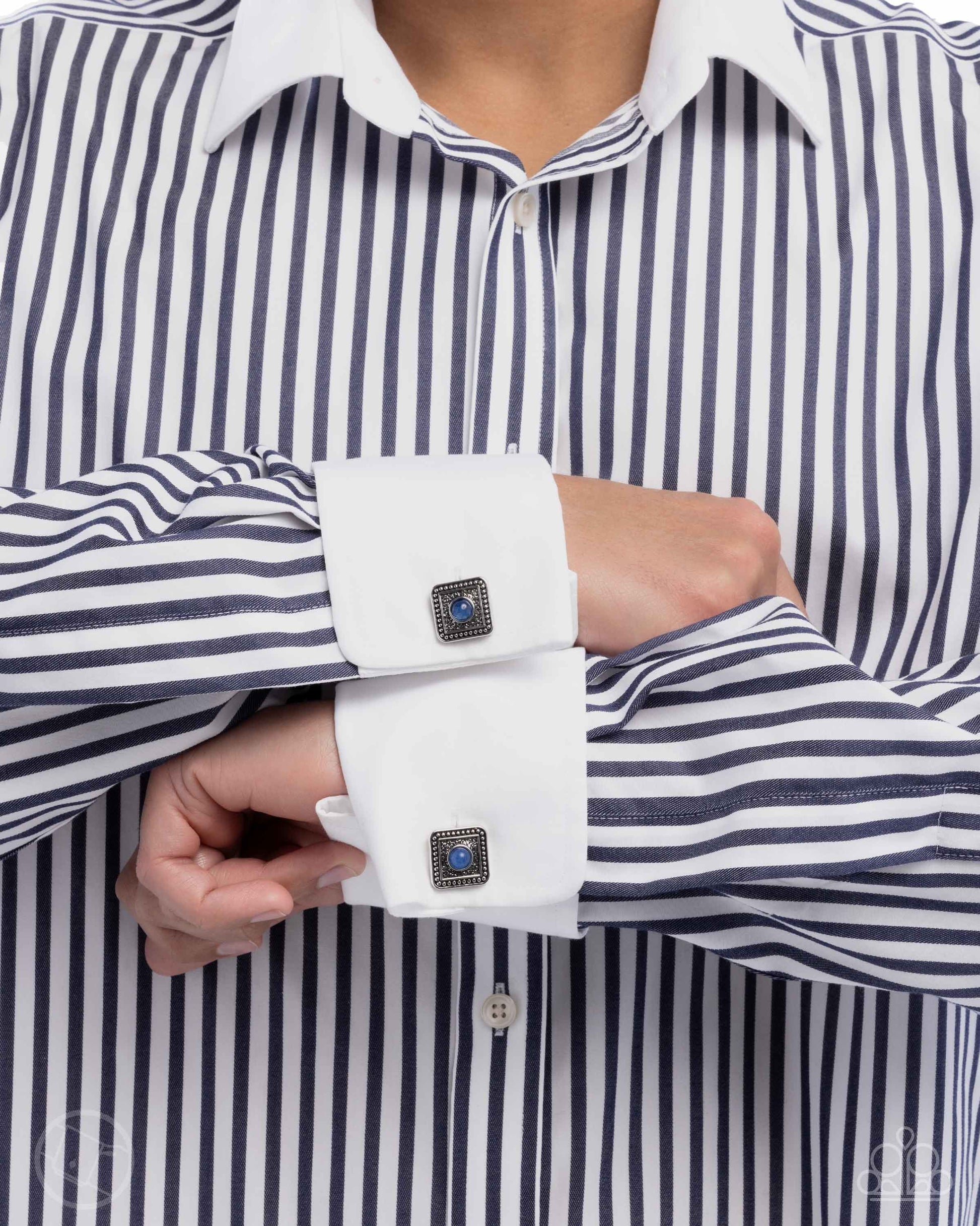 Dotted with a lapis stone, a rounded square-studded and textured silver cuff link stands out for an eye-catching display. As the stone elements in this piece are natural, some color variation is normal.