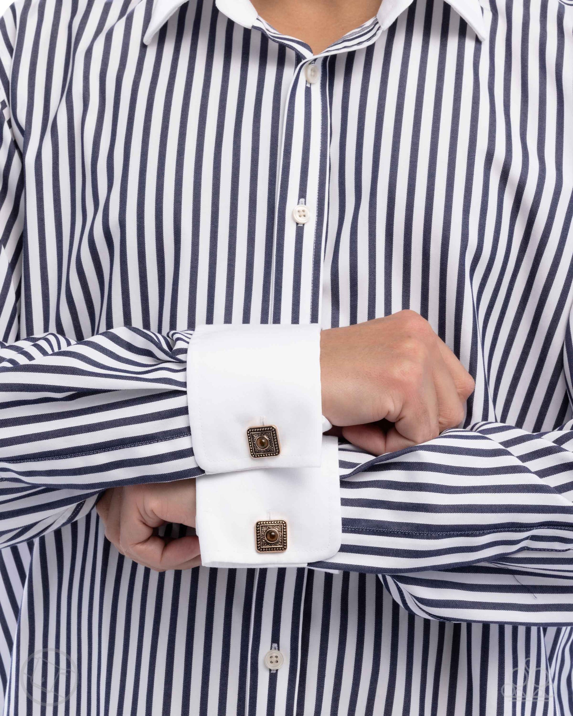 Dotted with a tiger's eye stone, a rounded square-studded and textured antiqued gold cuff link stands out for an eye-catching display. As the stone elements in this piece are natural, some color variation is normal.