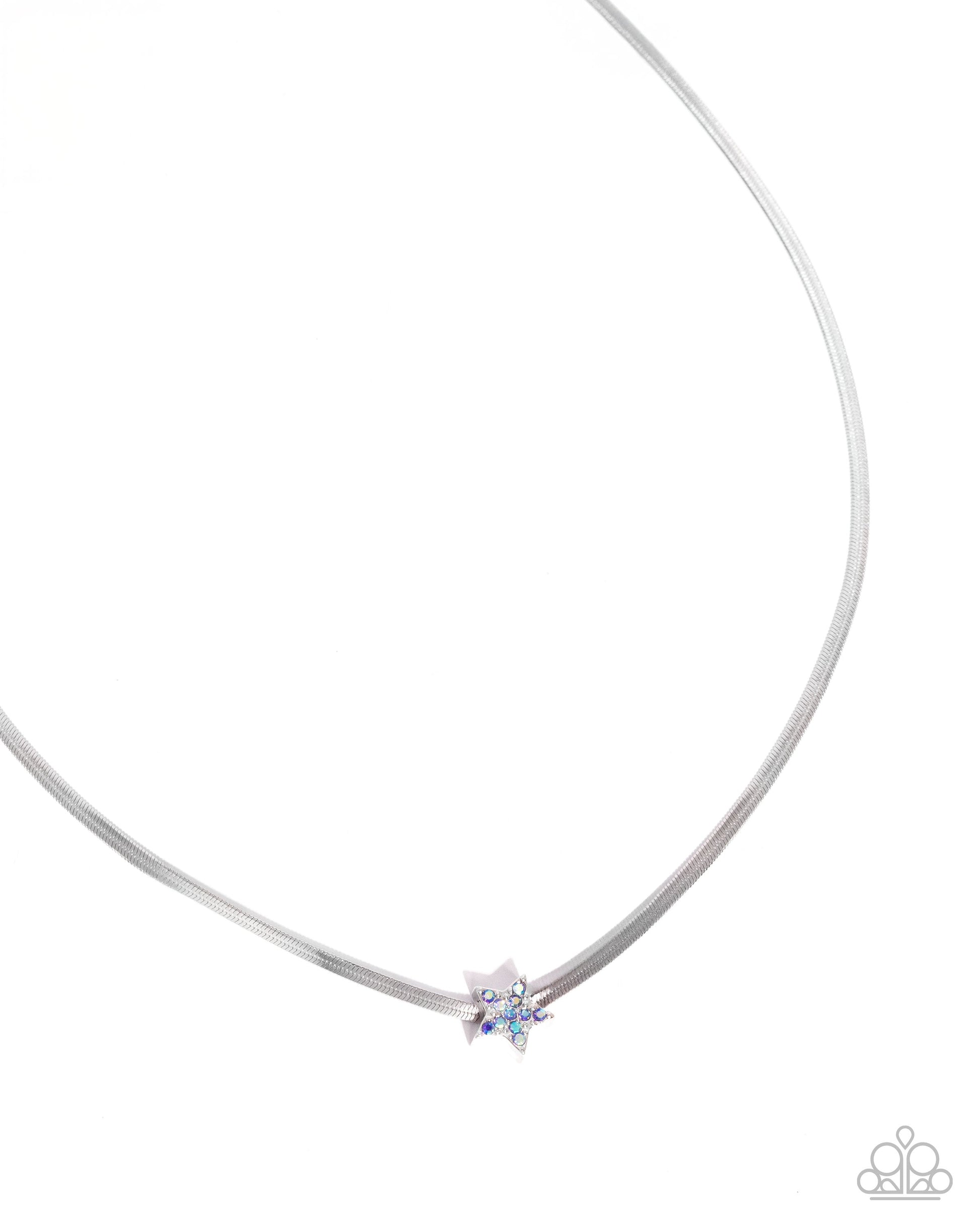Dotted with light sapphire iridescent rhinestones, a solitaire silver star glitters along the center of a blinding silver snake chain, resulting in a cosmic sparkle around the neckline. Features an adjustable clasp closure. Due to its prismatic palette, color may vary.