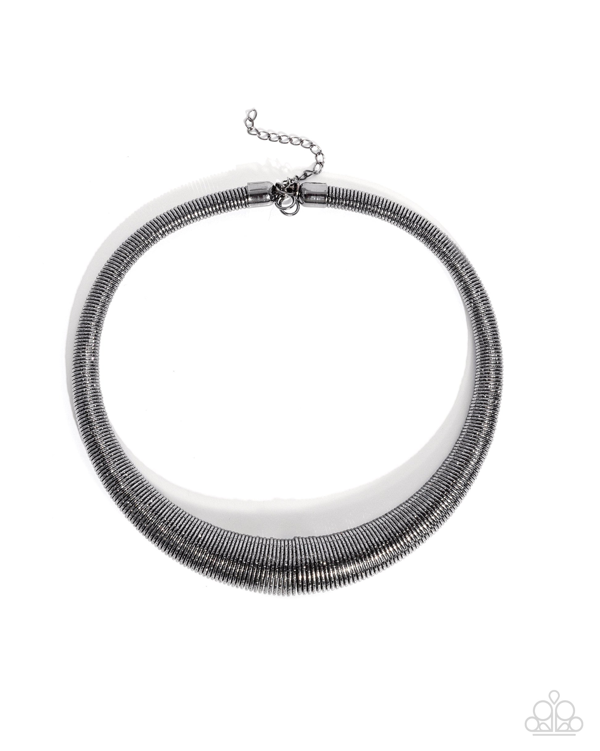 A thick gunmetal frame is comprised of tightly coiled metallic wires, creating a sleek and industrial-inspired design that hugs the neck with bold refinement. Features an adjustable clasp closure.