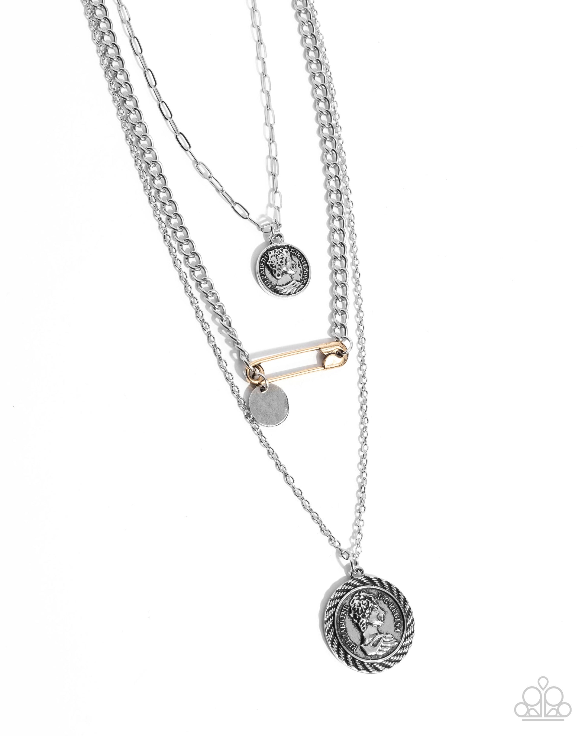 Mismatched strands of silver paperclip, curb, and dainty cable chains coalesce in a layered display below the neckline. Silver coin-like pendants in varying sizes glide along the uppermost and lowermost chains while an antiqued gold safety pin connects the centermost chain with an additional silver disc for a vintage, one-of-a-kind look. Features an adjustable clasp closure.