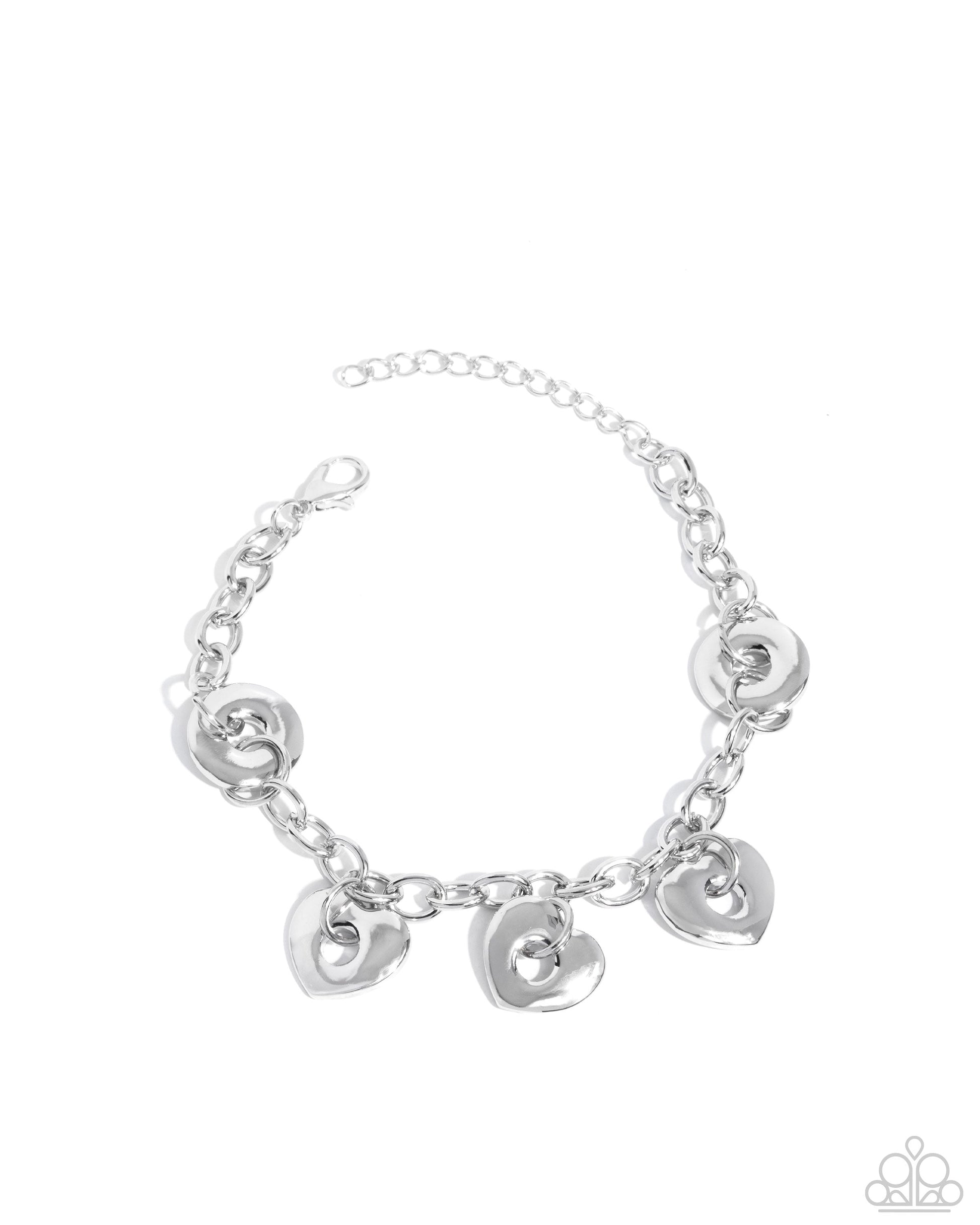 Linked together along a chunky silver chain, open heart and circle charms jingle around the wrist for a romantic and playful look. Features an adjustable clasp closure.