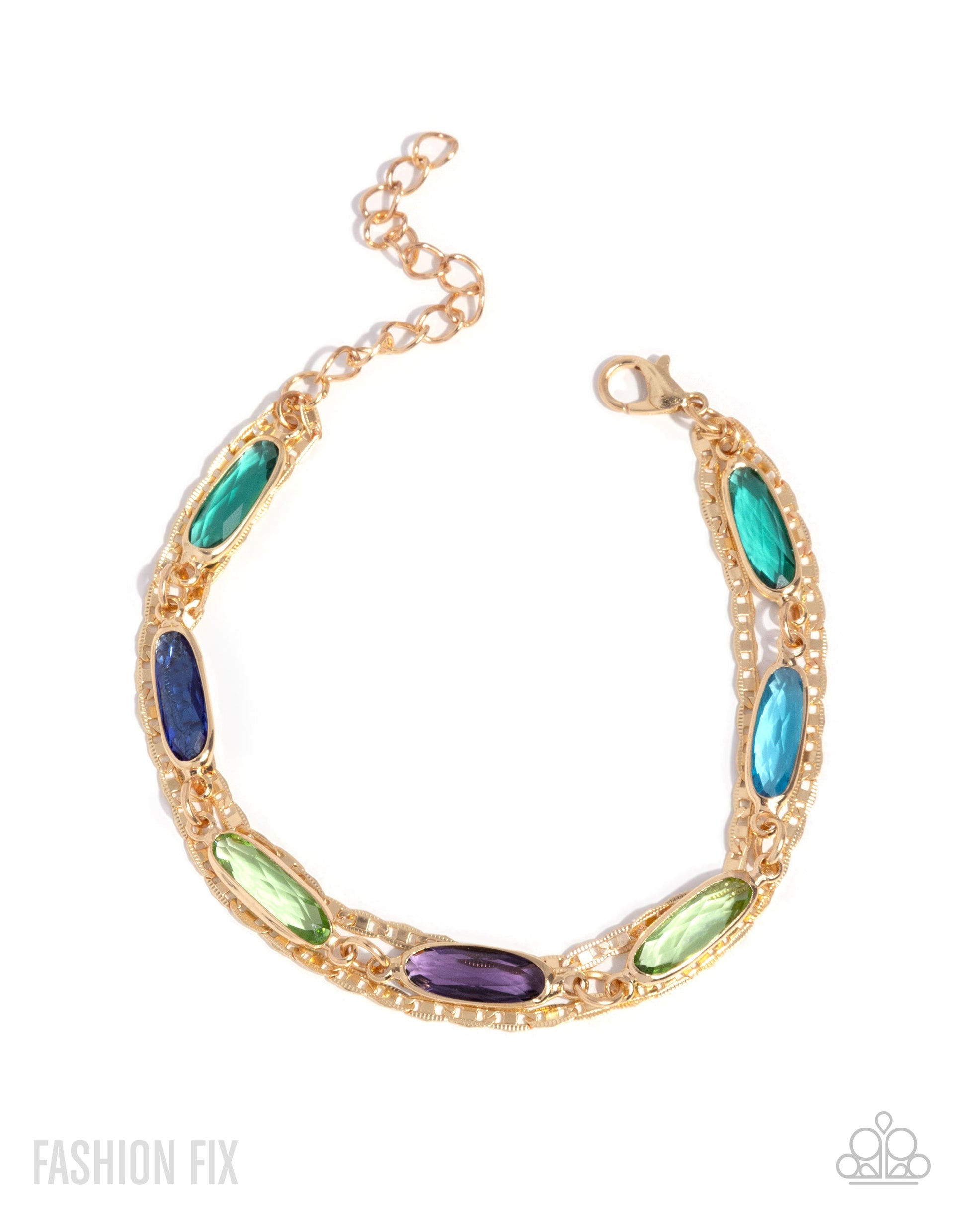 Featuring a mix of dainty textured and cable gold chains, a row of faceted, transparent multicolored acrylic oval beads encased in sleek gold frames joins the eclectic pattern, reflecting light with every movement for a chic, dimensional centerpiece. Features an adjustable clasp closure.