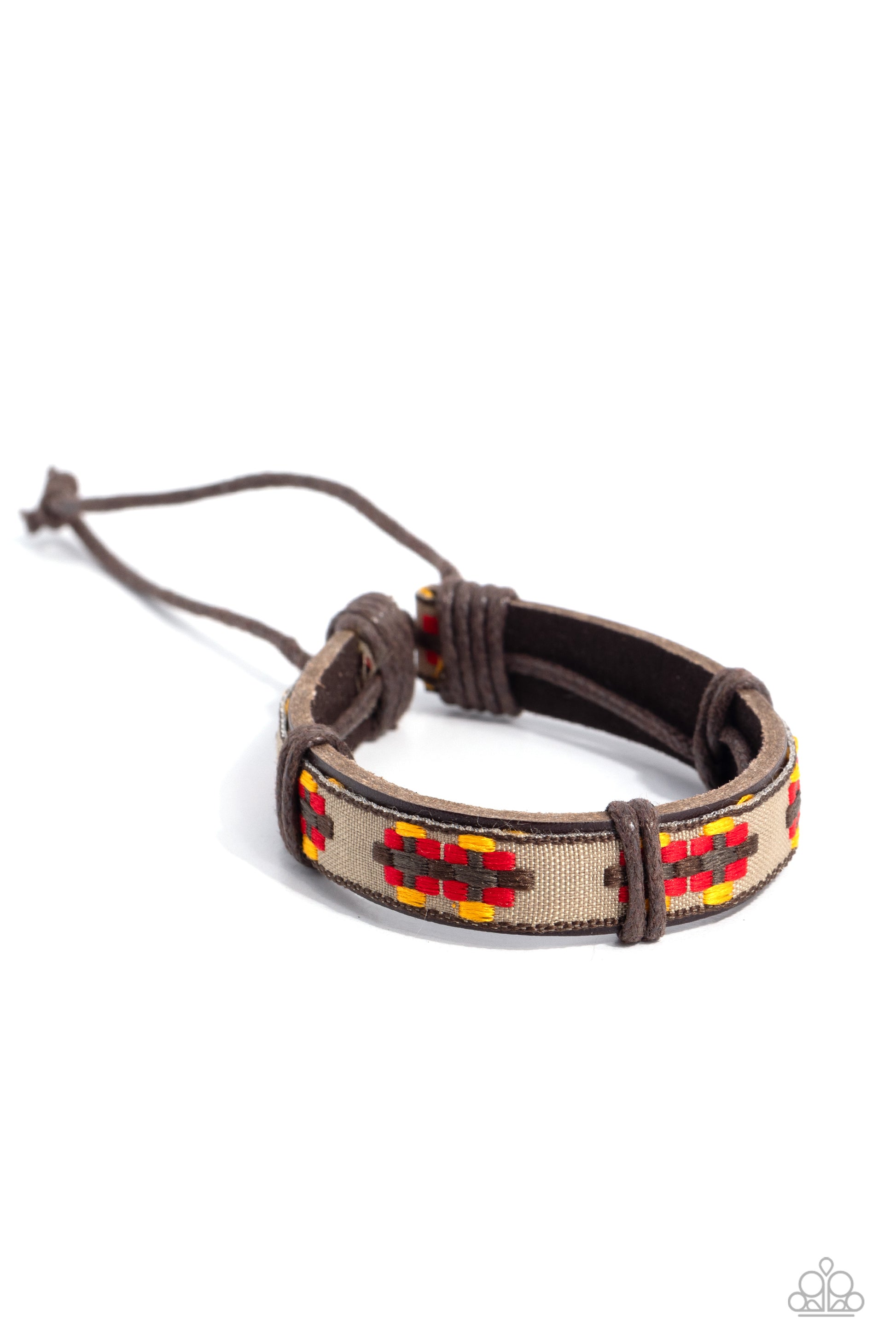 Stitched in a colorful textile pattern, a textured ribbon is knotted in place across the front of a brown leather band for a colorful urban flair. Features an adjustable sliding knot closure.