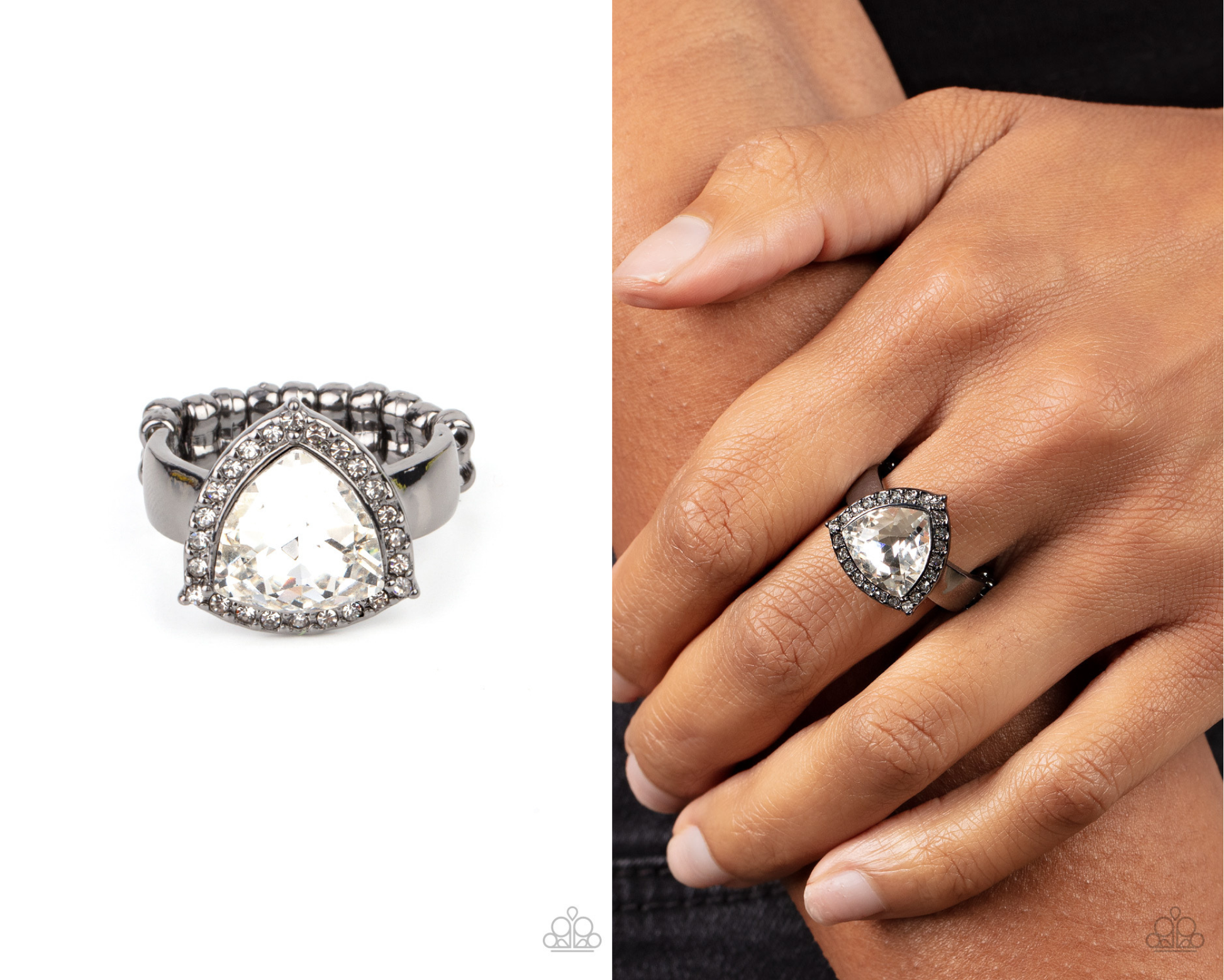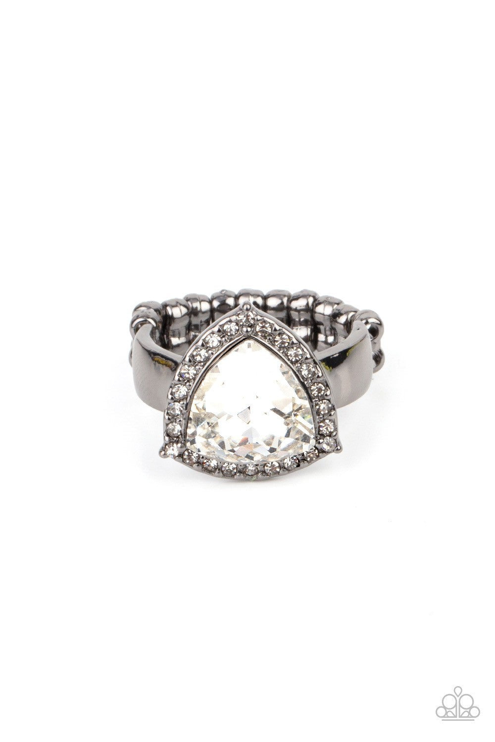 An oversized trilliant cut white rhinestone encased in a sparkling rhinestone-encrusted gunmetal frame steals the spotlight and creates an eye-catching stunner atop the finger. Features a dainty stretchy band for a flexible fit.