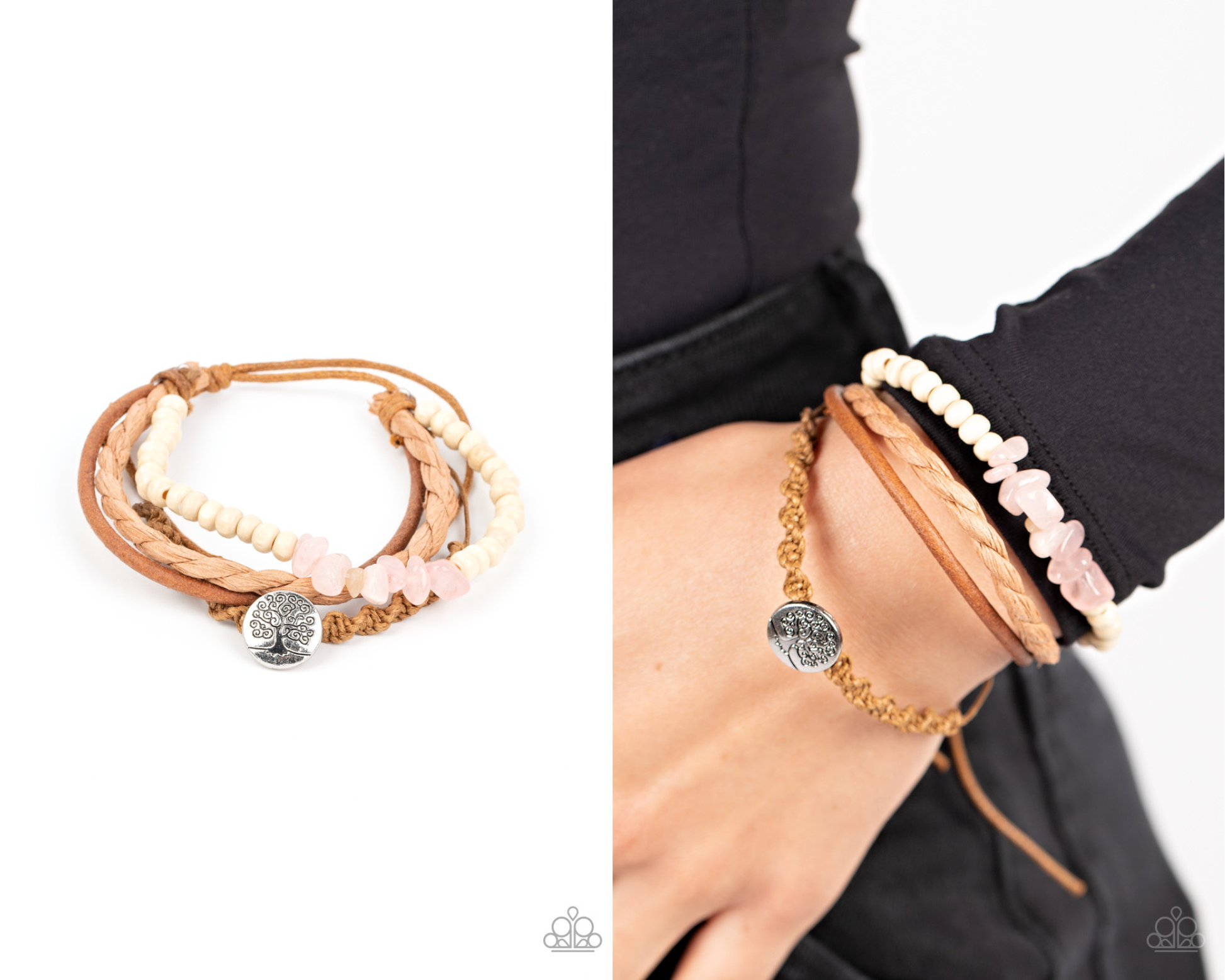 Infused with a whimsical tree stamped frame, mismatched strands of brown suede, braided cording, and twisted crepe-like bands layer with a strand of wooden beads and pink quartz stones around the wrist for a seasonal flair. Features an adjustable sliding knot closure.