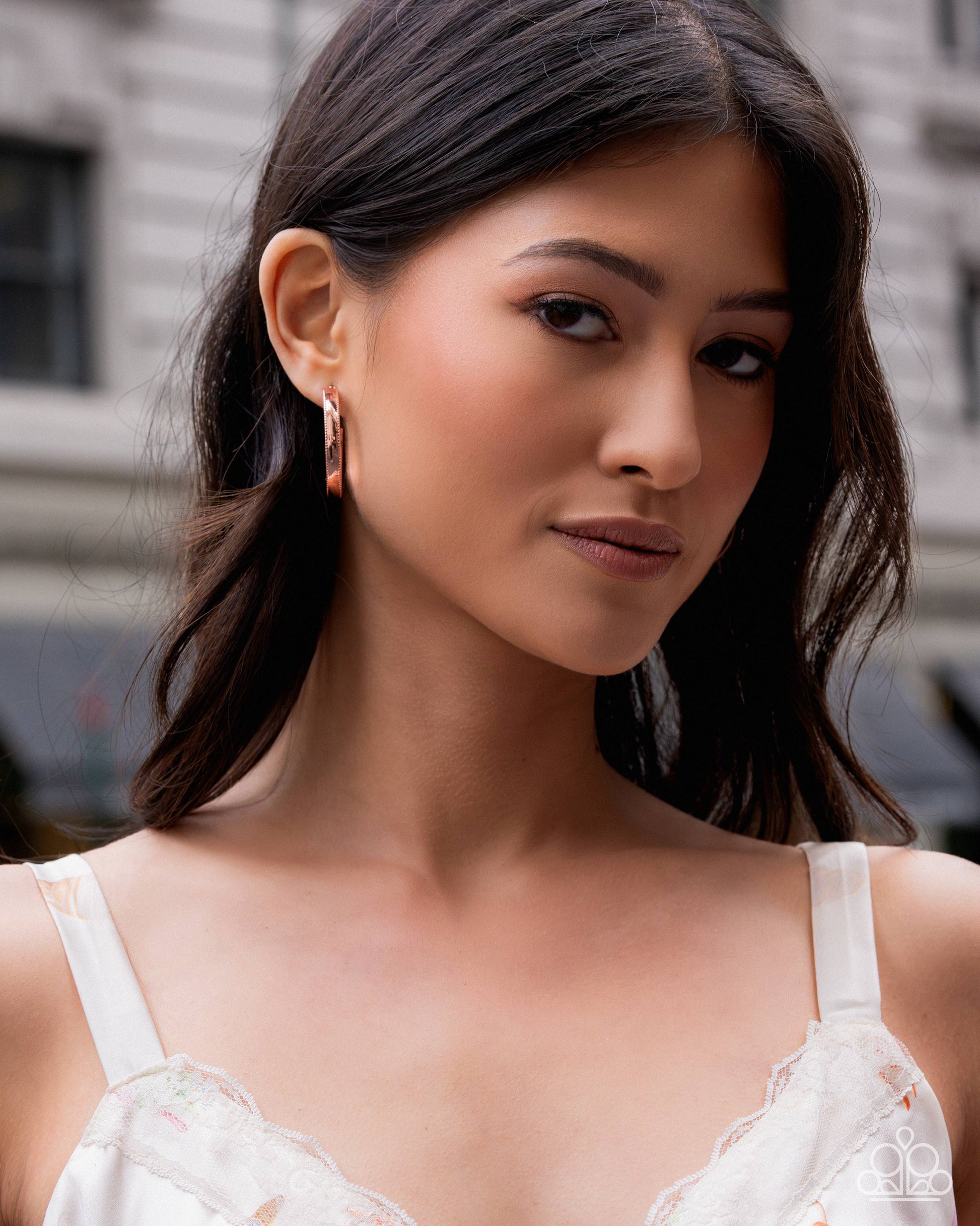 Featuring a subtly studded raised border, a thick ribbon of glistening shiny copper curls into a dramatic hoop for a bold industrial look. Earring attaches to a standard post fitting. Hoop measures 1 1/4â in diameter.