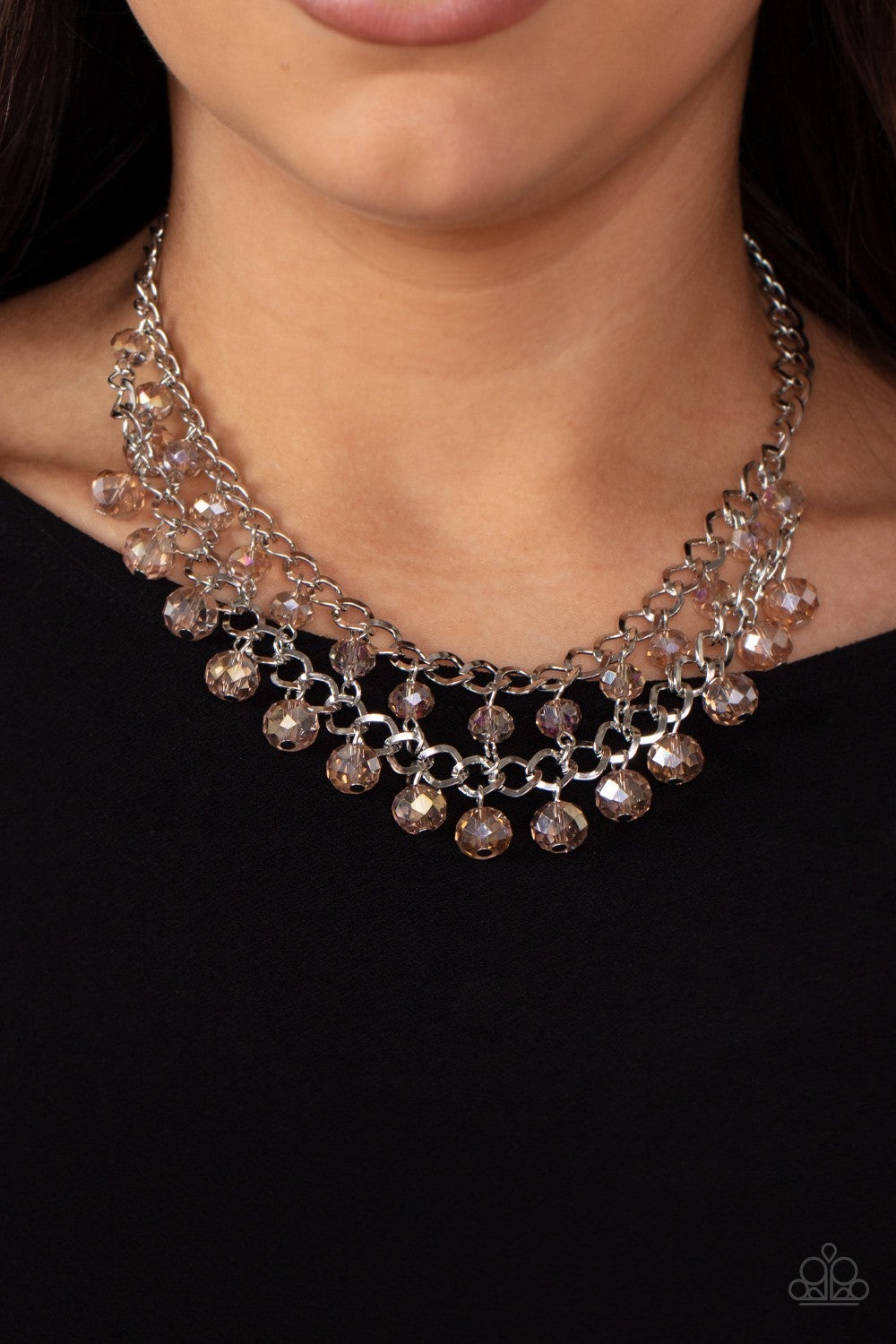Flecked in iridescence, two rows of brown crystal-like beads cascade from the bottom of two interlocking silver chains, resulting in a radiant fringe below the collar. Features an adjustable clasp closure.