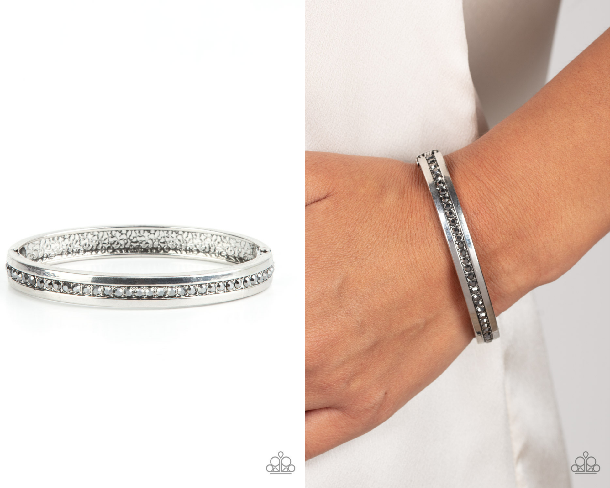 A smoky row of hematite rhinestones is encrusted along the center of a curving silver bar that hinges to a polished silver bar, creating a versatile bangle-like bracelet around the wrist.